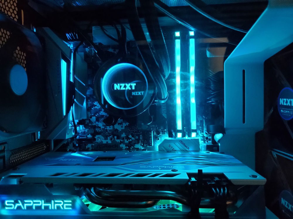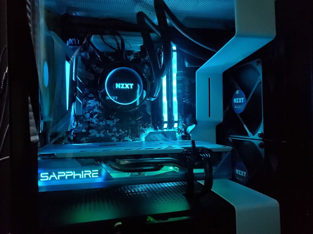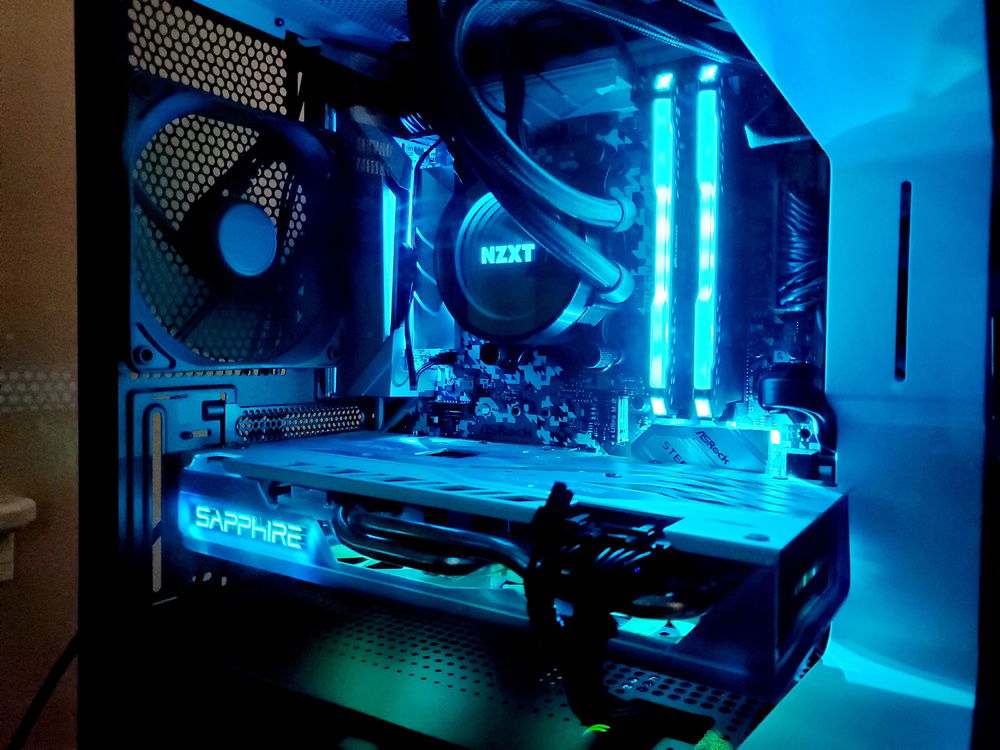 Ryzen 2600 clocked at 3.9 ghz, Corsair Vengeance RGB Pro (2x8) @ 3000mhz, Sapphire Nitro+ Rx580 Special Edition (1490mhz), ASRock b450m Steel Legend, NZXT Kraken x52, All inside a NZXT H400 in white