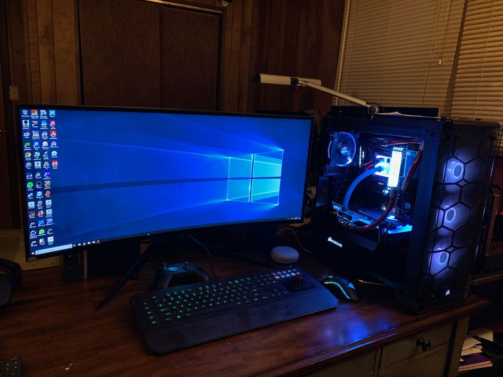 Corsair 570x RGB black (included 3 RGB fans) Asus Maximus X Formula Intel Core i9 9900k (overclocked to 5.0 Ghz. on all cores) 4 x 8Gb Corsair Vengance RGB 3600 Mhz. GIGABYTE AORUS GeForce RTX 2080 TI XTREME WATERFORCE WB EK-Supremacy EVO RGB CPU water block EK-CoolStream PE 360 radiator EK-XRES 140 Revo D5 RGB PWM water reservoir + pump Thermaltake Riing plus 12 RGB fans Corsair RM 1000i Samsung 970 EVO (500Gb) NVMe Samsung 860 EVO (1Tb) SSD