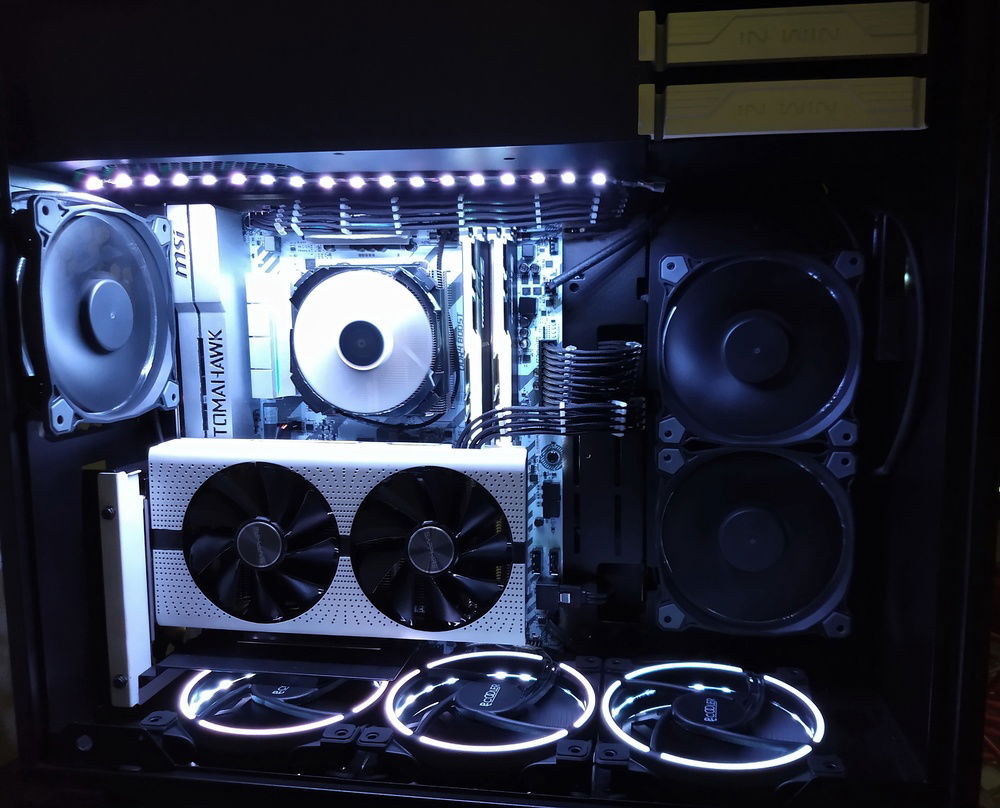 DIY stuff: I have painted some parts to match the color theme, like the HDD trays and the GPU, also i design and 3d printed a cover for the Motherboard I/O and wrapped the case with wood grain texture vinyl.