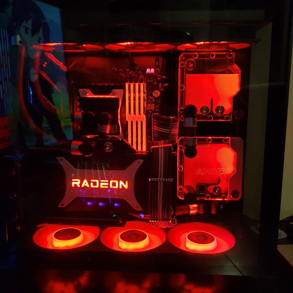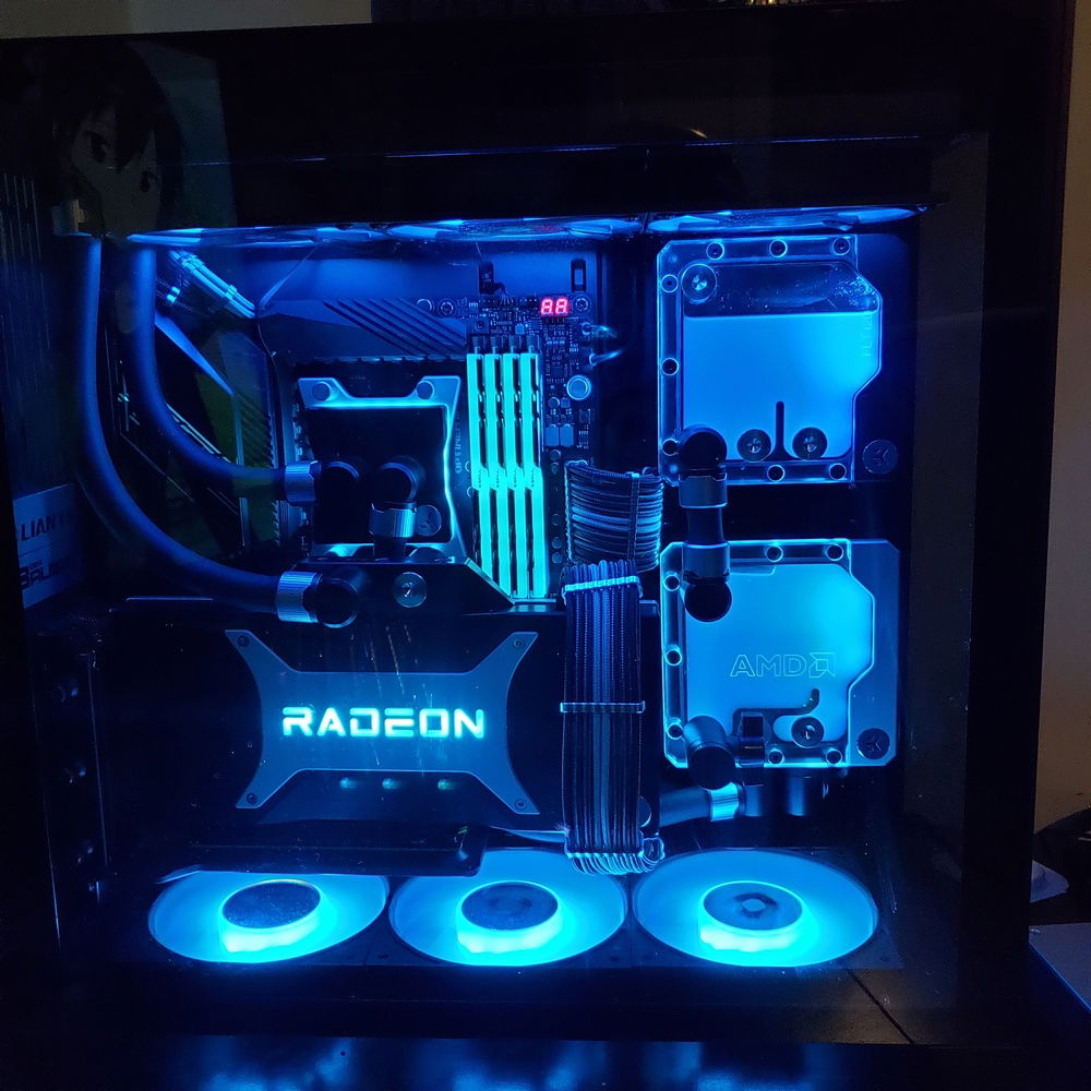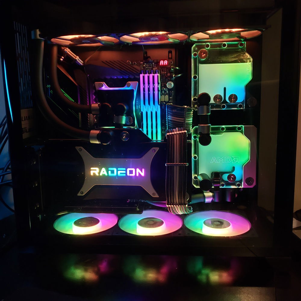 Build consists of an x570 dark hero motherboard, 32 gigs of g.skill neo ram at 3600 mhz CL14, a 5950x, and a 6900xt with EK waterblocks.