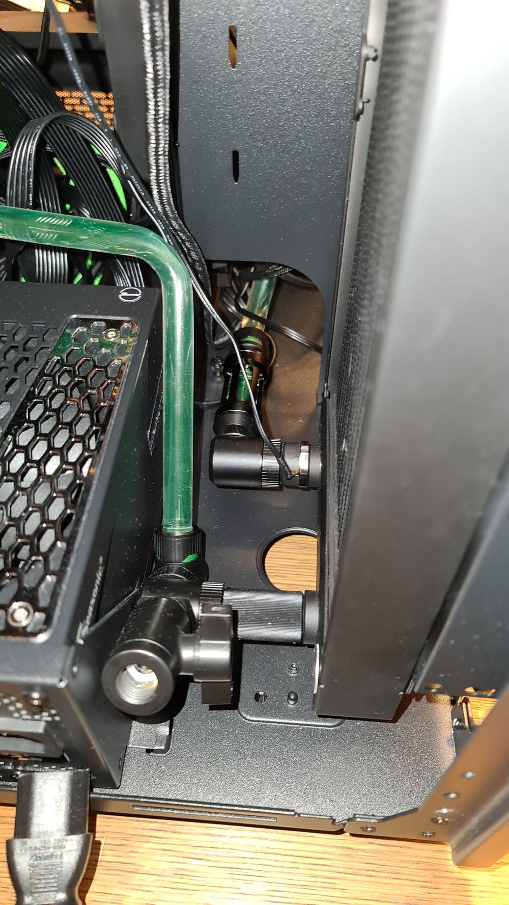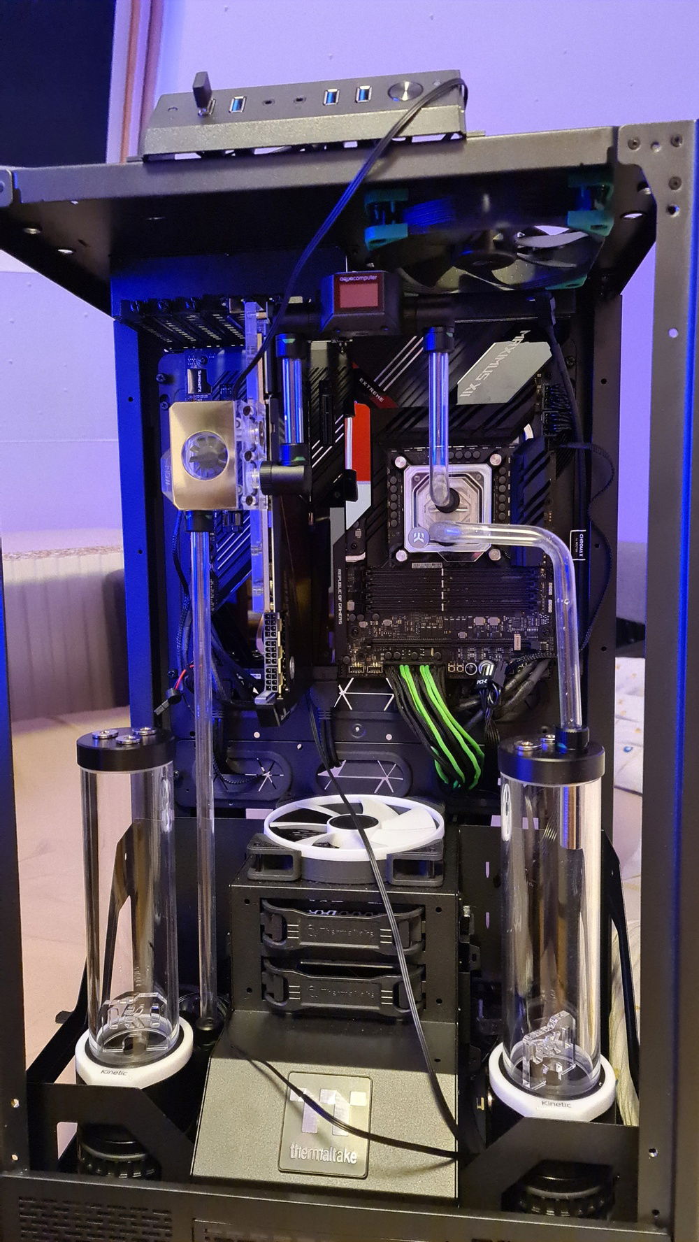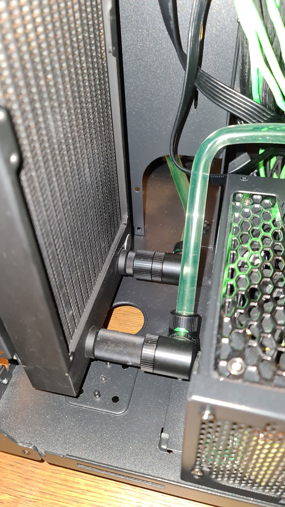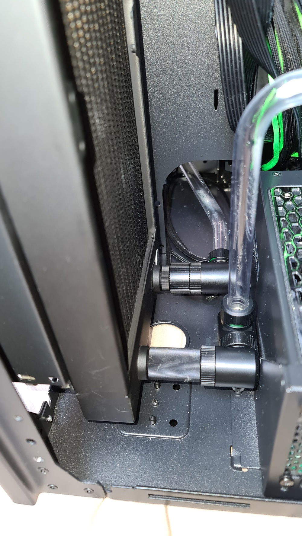 While I was quite enthusiastic about tube bending, I was not very happy with the bending itself. There are a lot of guides on the internet on how to do it, but I guess I'm impatient (because I try to be accurate). So summa summarum came out as it came out. I didn't like the end result anyway and I ordered Mayhems glass tubes. I will replace the capacitor after the correction on the graphics. I will put them in places that are in view. The pump outlets are hidden low, so there will be acrylics. Generally, for the first time in my life made water cooling, I am satisfied. The whole thing still needs small corrections (sleeve cables, cable arrangement).