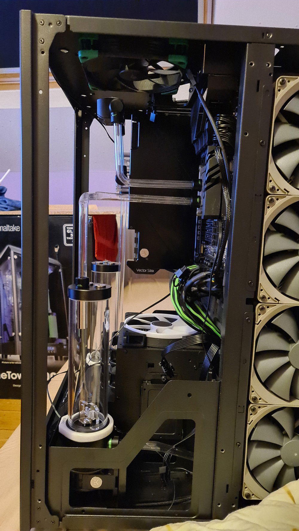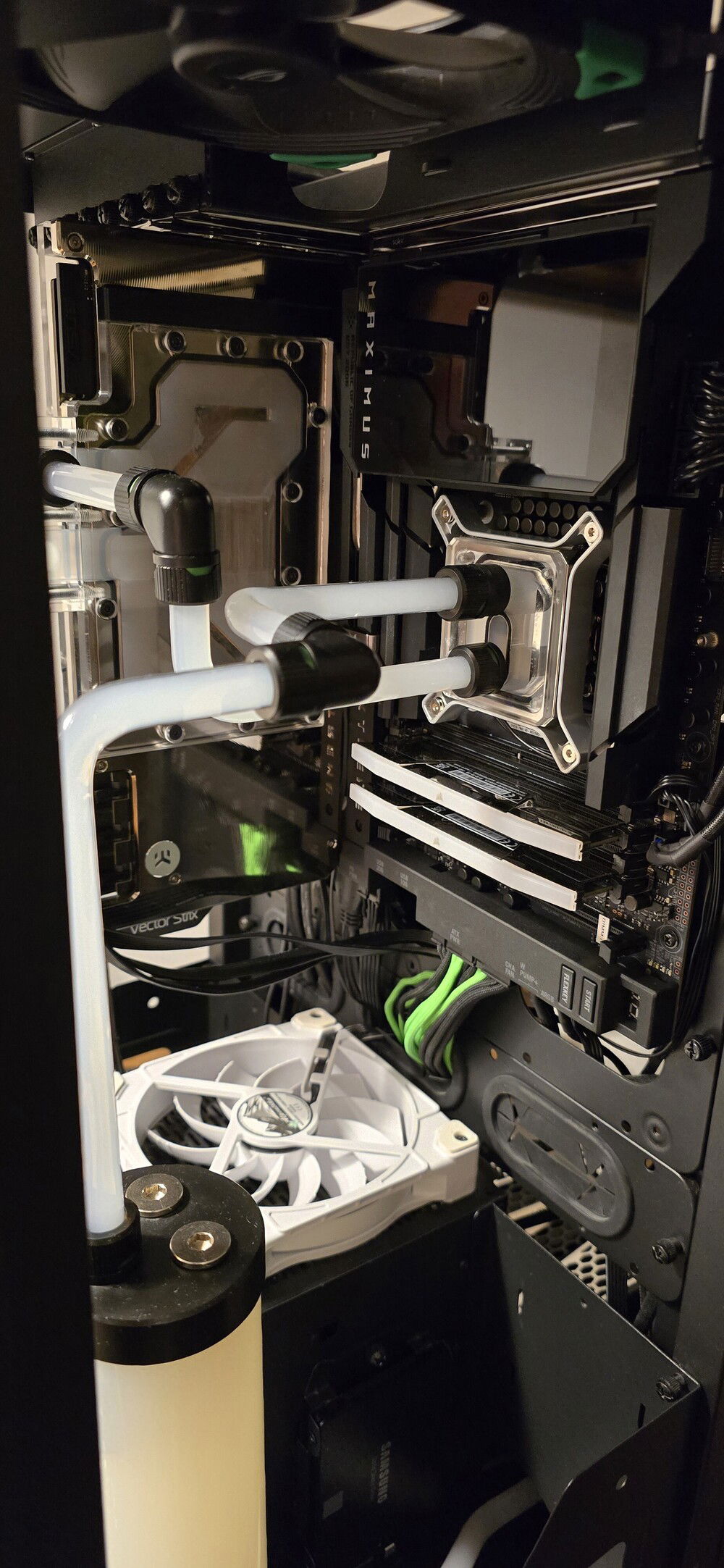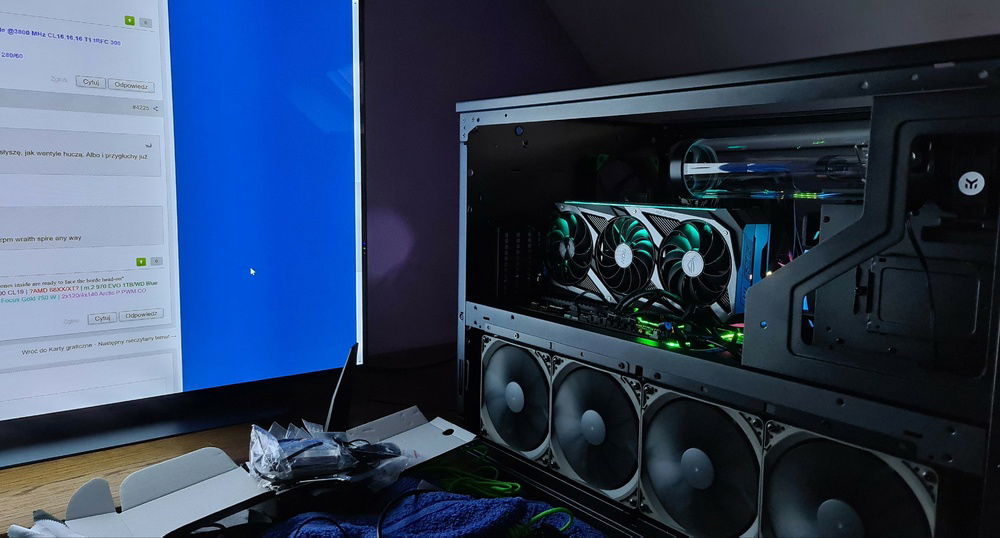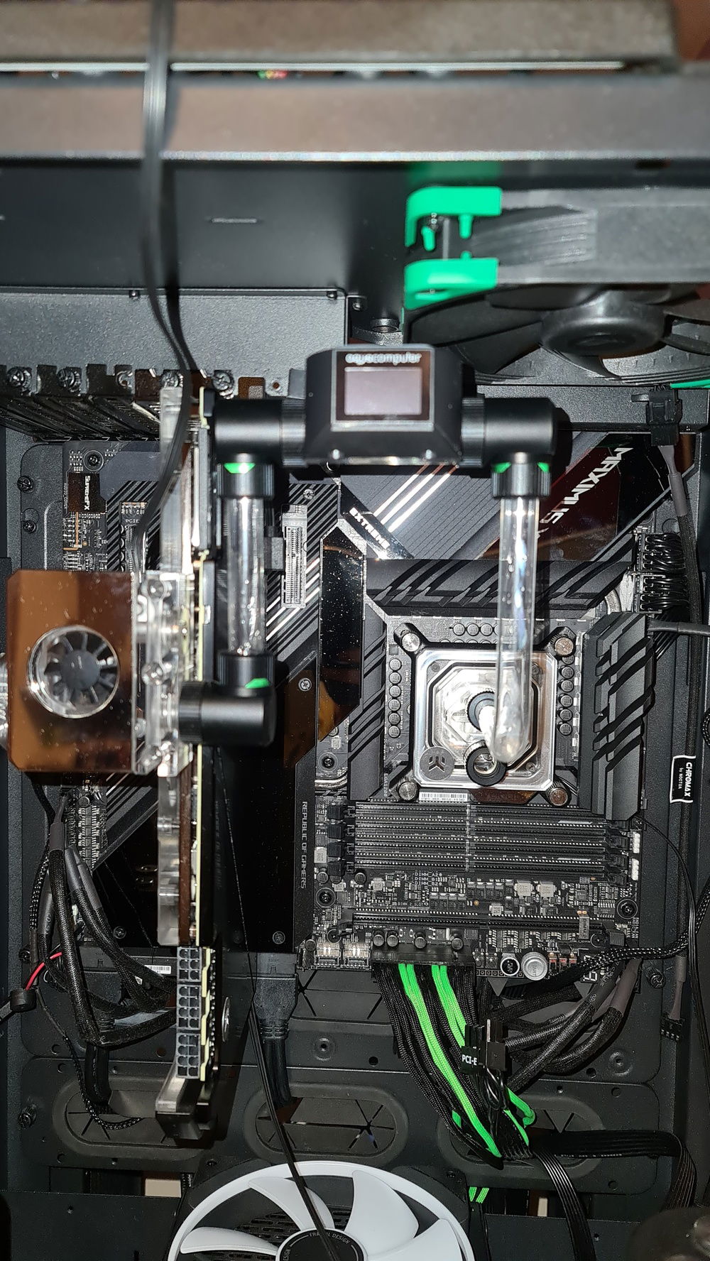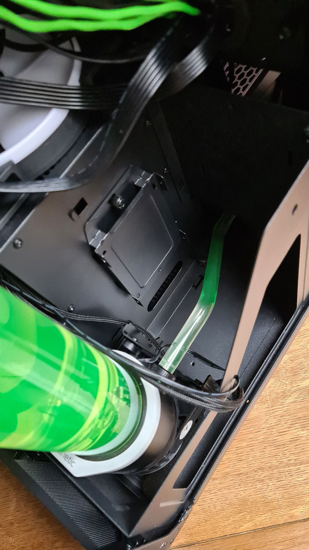While I was quite enthusiastic about tube bending, I was not very happy with the bending itself. There are a lot of guides on the internet on how to do it, but I guess I'm impatient (because I try to be accurate). So summa summarum came out as it came out. I didn't like the end result anyway and I ordered Mayhems glass tubes. I will replace the capacitor after the correction on the graphics. I will put them in places that are in view. The pump outlets are hidden low, so there will be acrylics. Generally, for the first time in my life made water cooling, I am satisfied. The whole thing still needs small corrections (sleeve cables, cable arrangement).