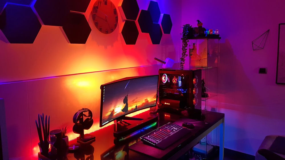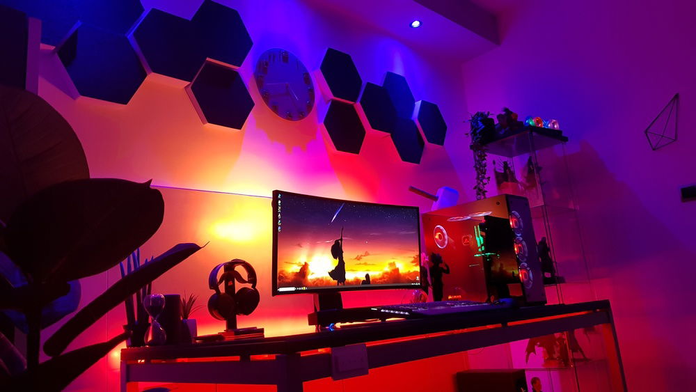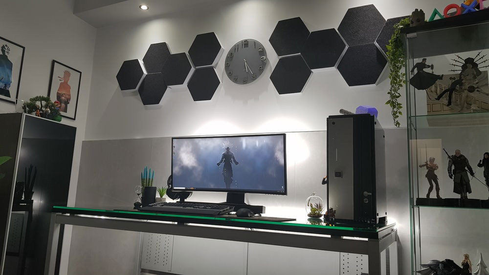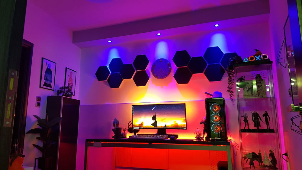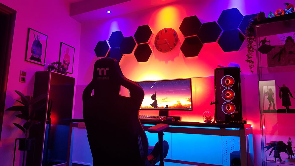 Desk: 185cm*80cm: Custom made- Oak wood painted black and steel frame painted grey with custom made glass on top. Lighting: 1.Philips Hue Led strips plus 2m *2 2.Philips Hue play*2 3.Philips Hue go*2 4.Philips Hue GU10 color *3 5.Philips Hue Beyond Console Setup: 1.Philips 43PUS7304 "The One" 2. PS4 Pro white 1TB 3.PS4 VR