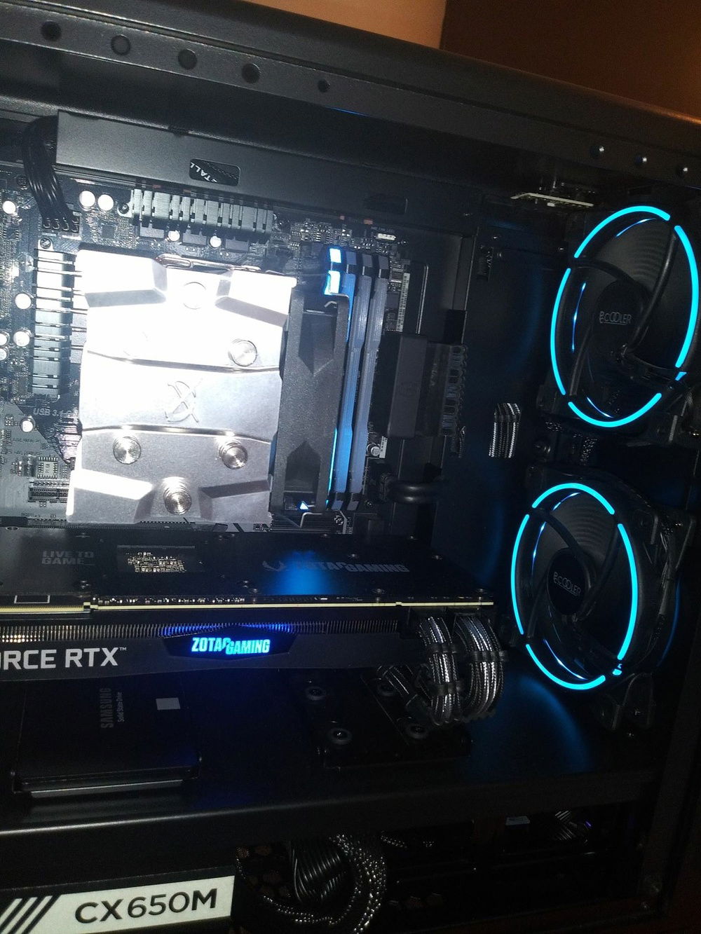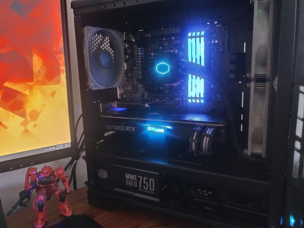 Ryzen 5 2600x Zotac RTX 2070 Super Corsair 32gb 3000mhz rgb ram Asrock b450 pro 4 Corsair 650w 80 bronze modular psu Samsung 970 evo m.2 500g Samsung 870 ssd 500g Seagate barracuda 4tb hard drive Sycth cooler MC cable extensions PC cooler rgb fans MSI wifi network and Bluetooth card Cooler Master 24pin angle adapter Metallic Gear Neo v2 case