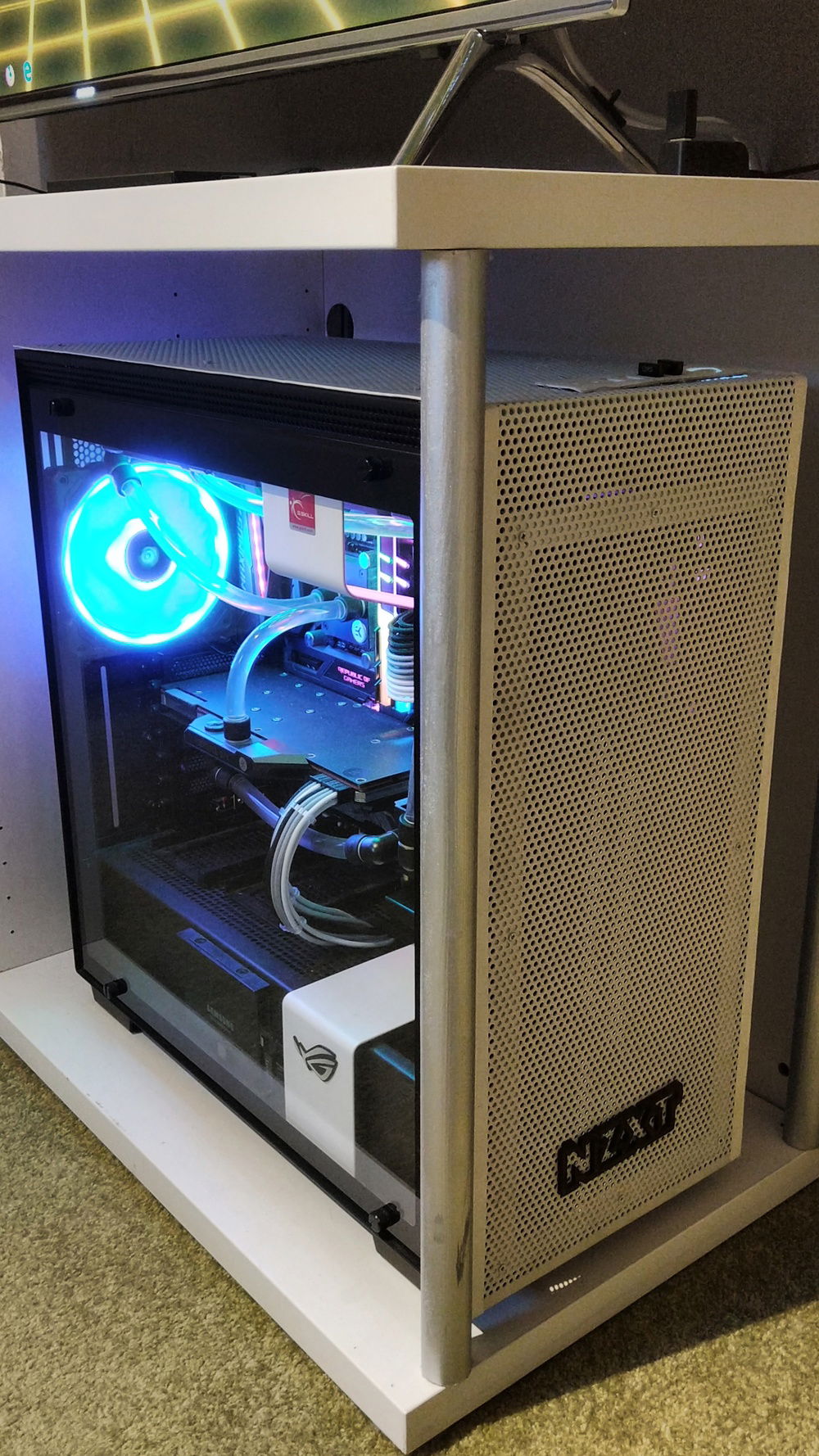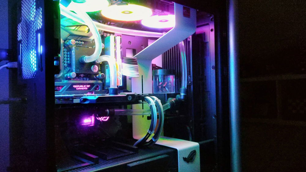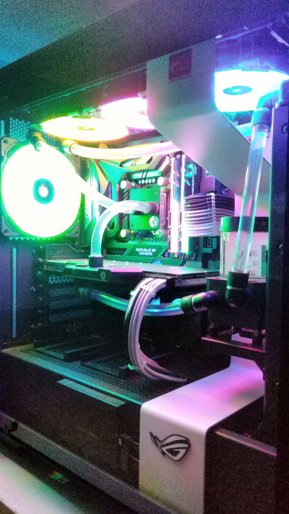 Board: Asus Maximus X Code Z370 CPU: Intel Core i7 8700K RAM: 16GB G.Skill Trident Z RGB, 3200Mhz PSU: BeQuiet! Dark Power Pro 11, 550W Case: NZXT H700i Cooling: EK Fluit Gaming 2x 360 Radiator, 4x Corsair LL Fans, 3x BeQuiet! Silent Wings 3 Fans GPU: Nvidia Titan Xp Star Wars Jedi Order Collectors Edition SSD: Samsung 750 Evo 250GB, Samsung PM961 m.2 NvME 1TB Mods: Self made front and top case panels with 3d printed NZXT logo and front IO shield. Cabelmod PSI-E and 24 pin sleeved cables. Monitor: Samsung SUHD TV UE49KS7090 Periphery: Logitech G603 (Mouse), G613 (Keyboard), G933 (Headset), Steam Controller