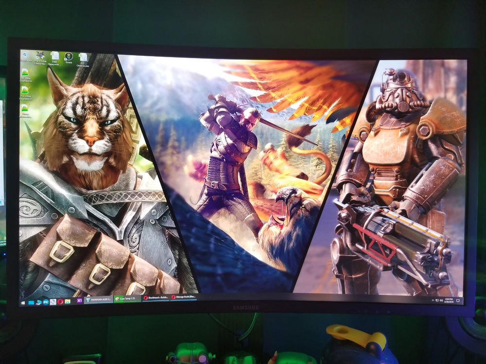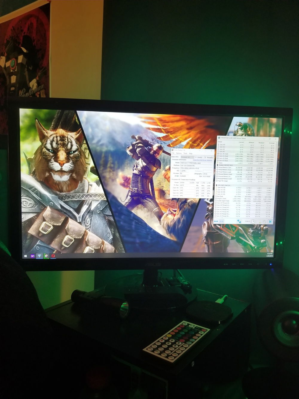 My CPU has been delidded, liquid metal applied, and then relidded. It is overclocked to 4.8GHz at 1.155 Volts. My RAM is overclocked from 3,000MHz to 3,200MHz as well. There will be two monitors listed in the hardware list of my build; the Samsung is my main screen, and the ASUS is a secondary that I display HWiNFO64, Core Temp and Precision X1 on while gaming.