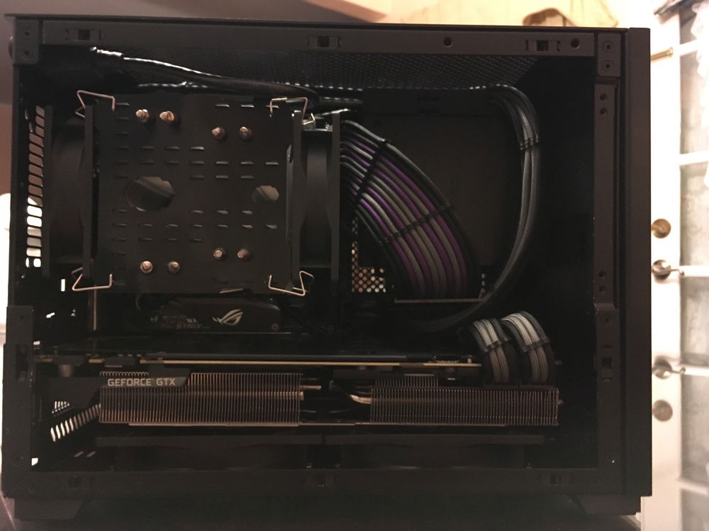 The cpu cooler is massive and imposing, which while isn't to some people's taste, is something that I absolutely love. The 1080 Ti Strix is installed as a quick and dirty Accelero mod, which involved removing the fans and installing the bare heatsinked card with 2x120mm fans in exhaust under it.