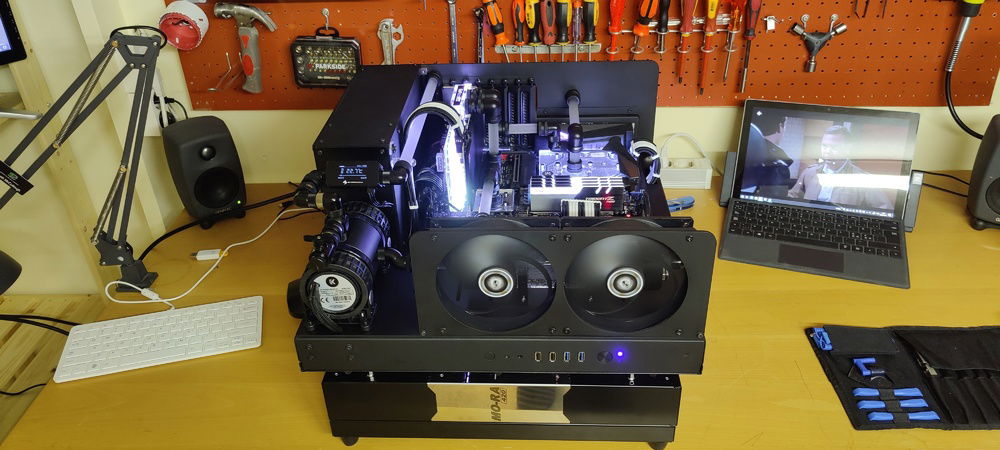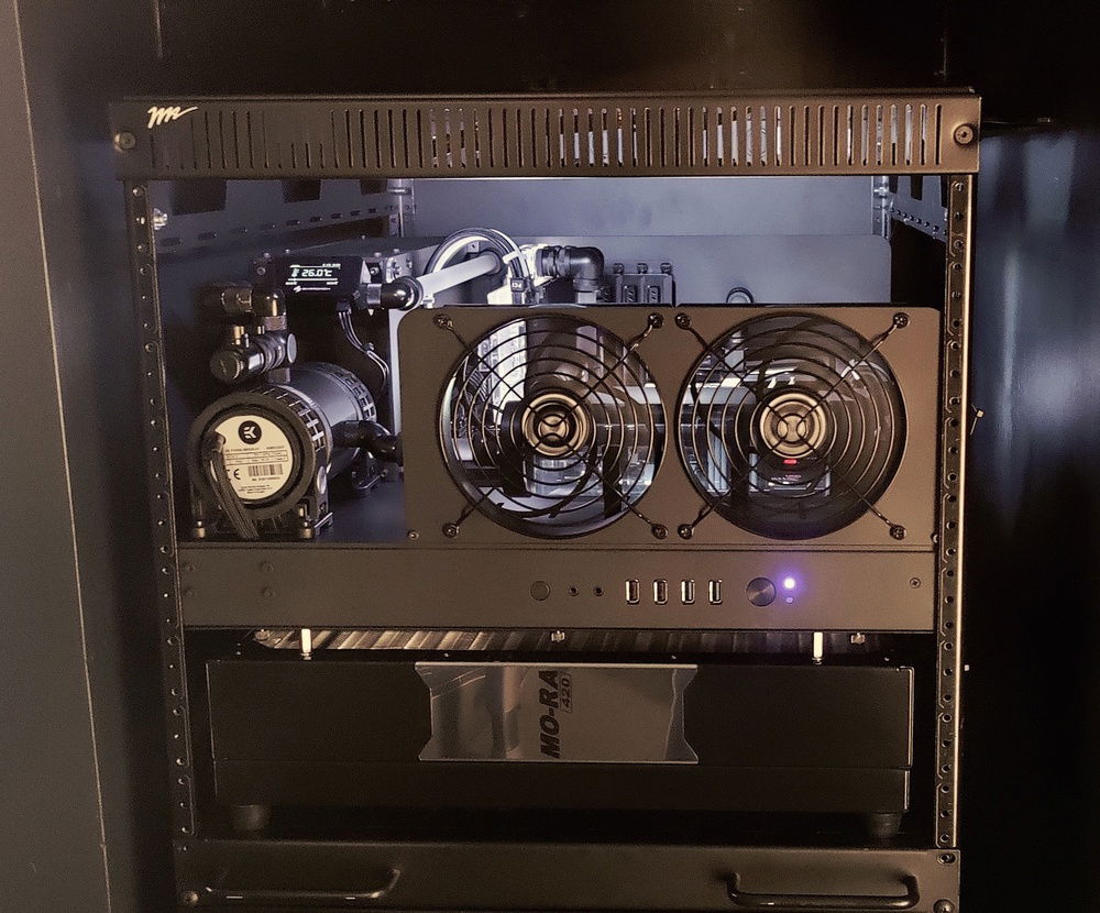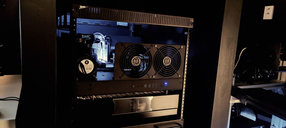 I have most of my computers and hardware mounted in a rack in my mancave/office but it is impossible to find a nice looking rack mounted case that can house a custom loop with enough rads to cool a RTX 3090 and the AMD 5900x. So I started testing different cases and found that the Thermaltake Core P3 actually fits really good on a shelf in my rack, it is good to point out that the case is wider than a normal 19" computer case and needs to sit within 19" mounting rails (see the pictures for more details).