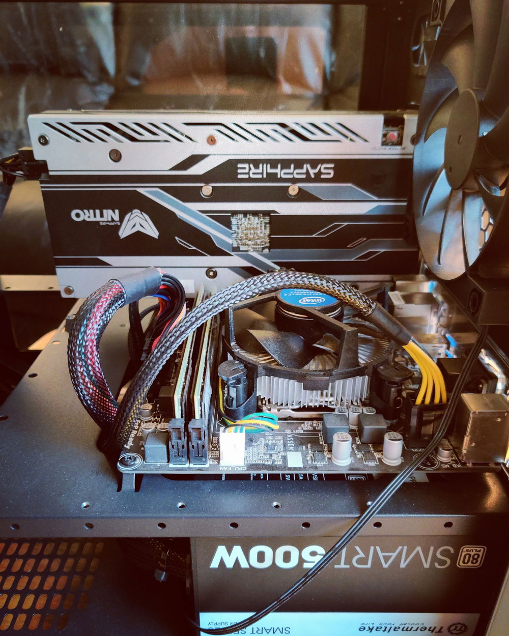 CPU / Motherboard / Cooler The motherboard was a spare micro-atx board I had lying around with no use for since it's not overclockable. This actually worked out pretty well since I had a bunch of Intel stock coolers that I was about to recycle anyway, so I figured I could try one out here to save some money. I kinda wish I went even more budget and used an 4th gen i5 instead, but I wanted my buddy to have those extra threads for Destiny 2. The CPU actually did really well while gaming and never went up above 65c.