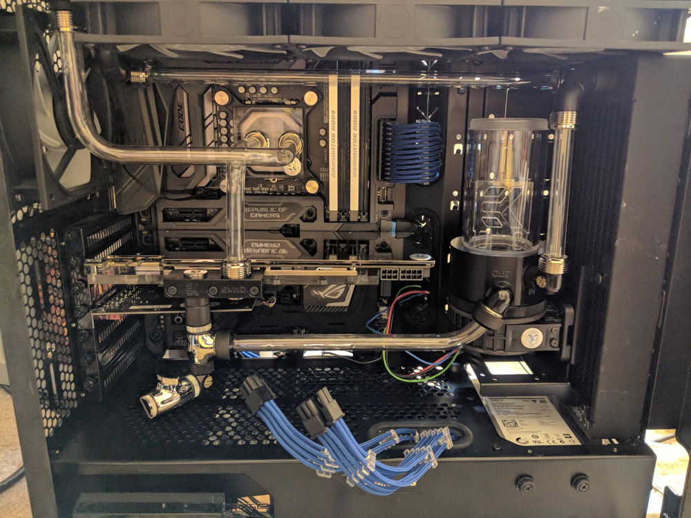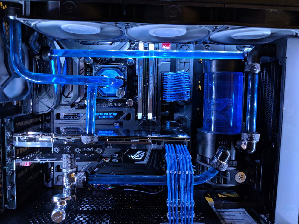 Custom Water Loop consists of EKWB blocks with PrimoChill Rigid Tubing. The fluids is Mayhems X1 with Mayhems Blue Dye.