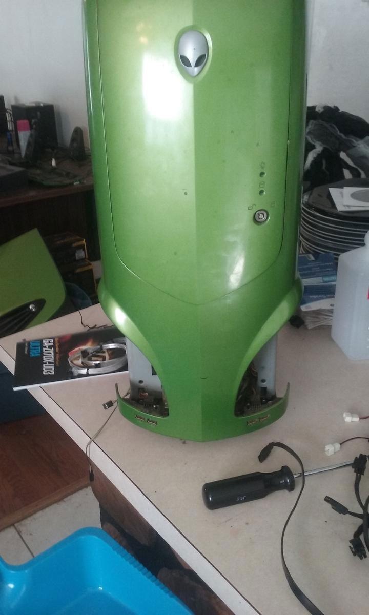 OK....OK so I have had my computer case for a long time. Its been through hell but is still kicking. So I finally decided to show him some love and over the last few years Ive been upgrading him steadily. I gutted him after Katrina though his parts were trashed cause of the water and mud, I wasnt giving up on him. I worked frantically getting him cleaned and ready for new parts. I rebuilt him as a AMD based machine ( effectivly changing him from a Area 51 to a Auroura) but quickly realized Bob wasnt built for modern parts so I had to start modding him....