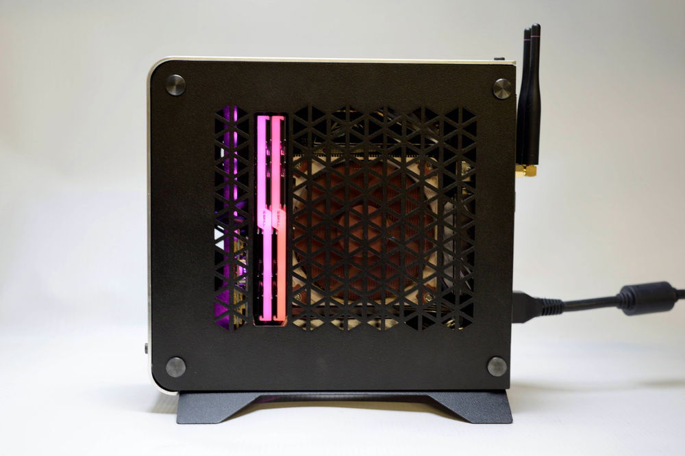 The case is the main focus of this build- the Boreal B35 is a unique one-off case made of powdercoated steel, with pressed threaded nuts. The front/top panel is a single piece of brushed aluminum. The case was designed from scratch and manufactured with the help of Protocase. The side panels allow for good air flow throughout the case and show off the RGB G-Skill RAM modules. There are three 60mm intake case fans on the bottom of the case, providing additional cooling to the GPU, VRMs, and custom G-Unique power supply. The fans also create positive air pressure inside the case, which prevents air stagnation and provides better air circulation. The only feature at the front of the case is a single custom power button with RGB which is synced with the lighting on the RAM and motherboard via Aura.