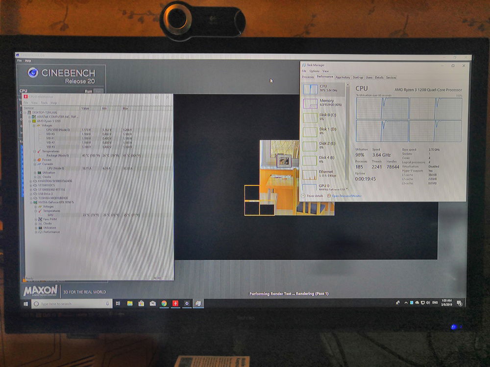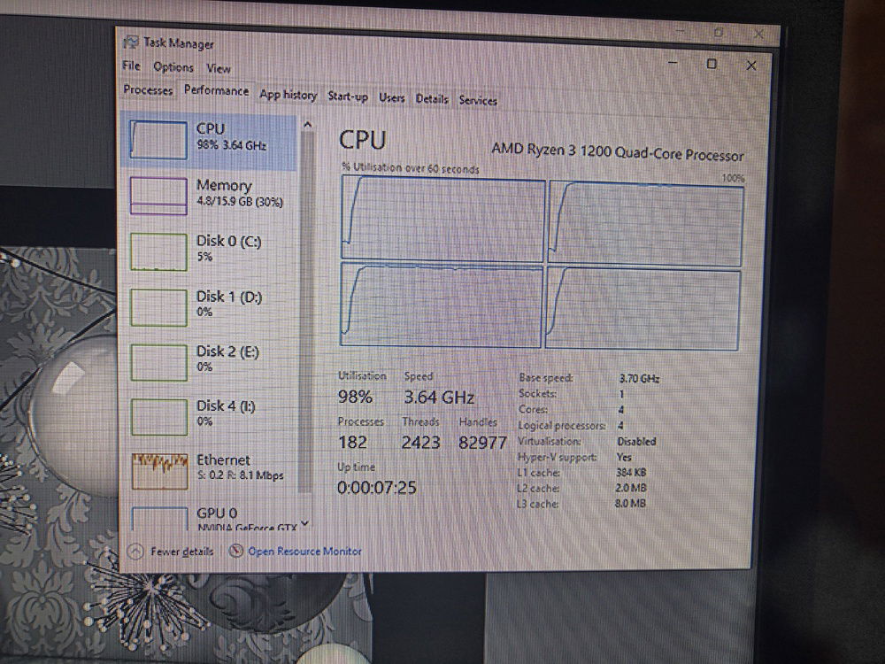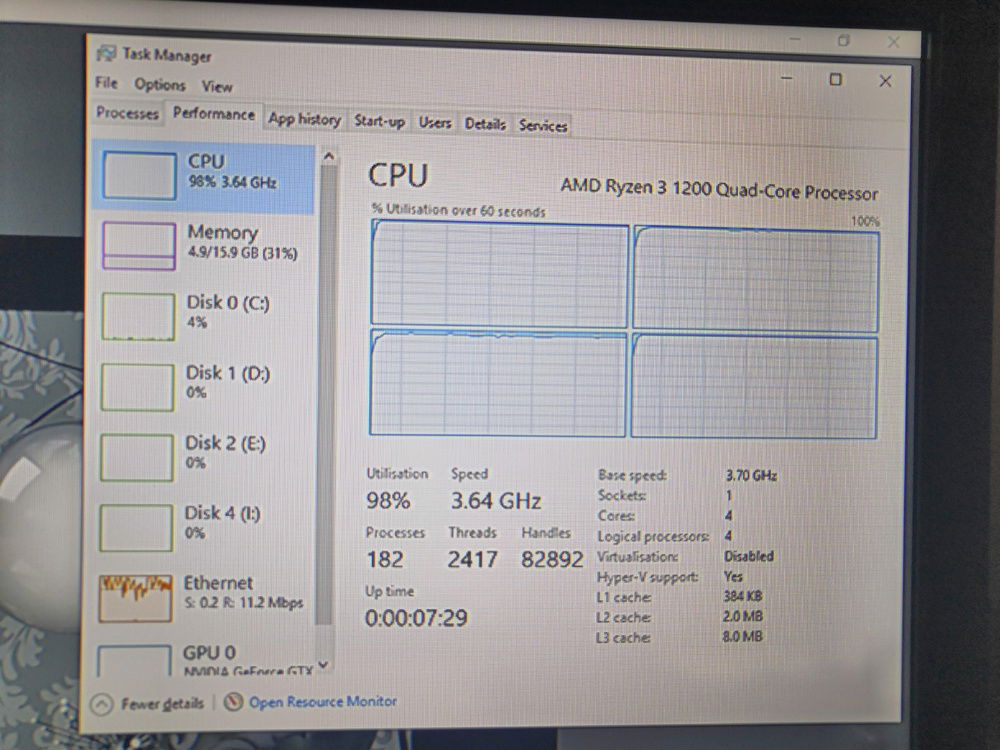 A Low-Mid range AMD Ryzen gaming build which features cooler master AIO Liquid cooling, an RGB LED strip and LED Fans. CPU - Ryzen 1200 Corsair vengeance 8GB Ram Kingston 240GB SSD GOU - EVGA Nvidia Geforce 1050Ti 4GB Windows 10 Home Cooler Master MasterBox 5 white Case RGB water cooler RGB LED strip.