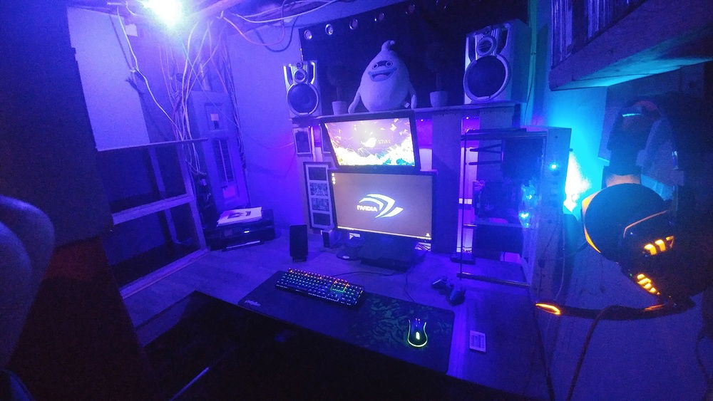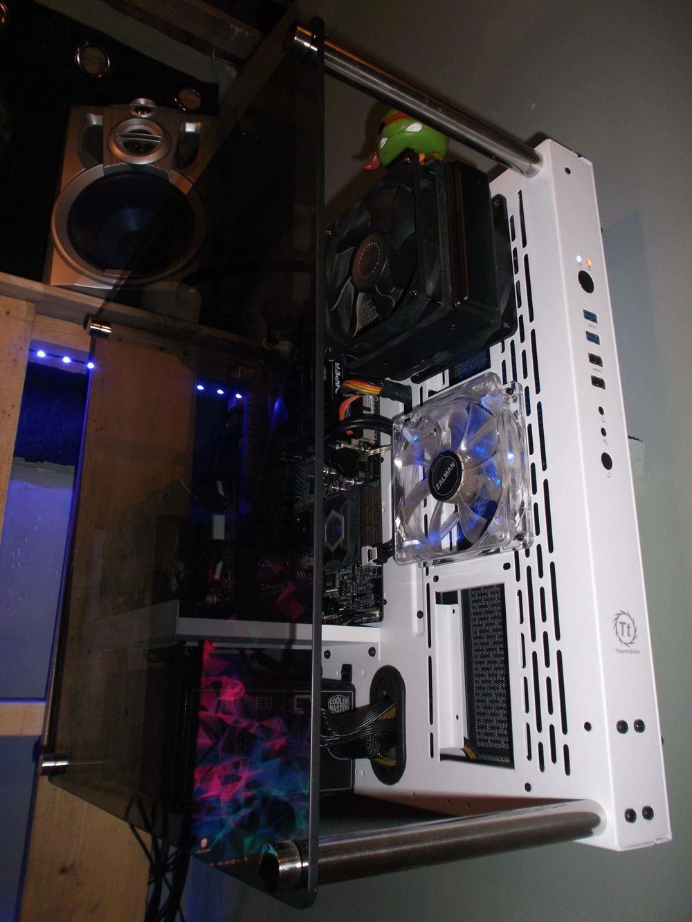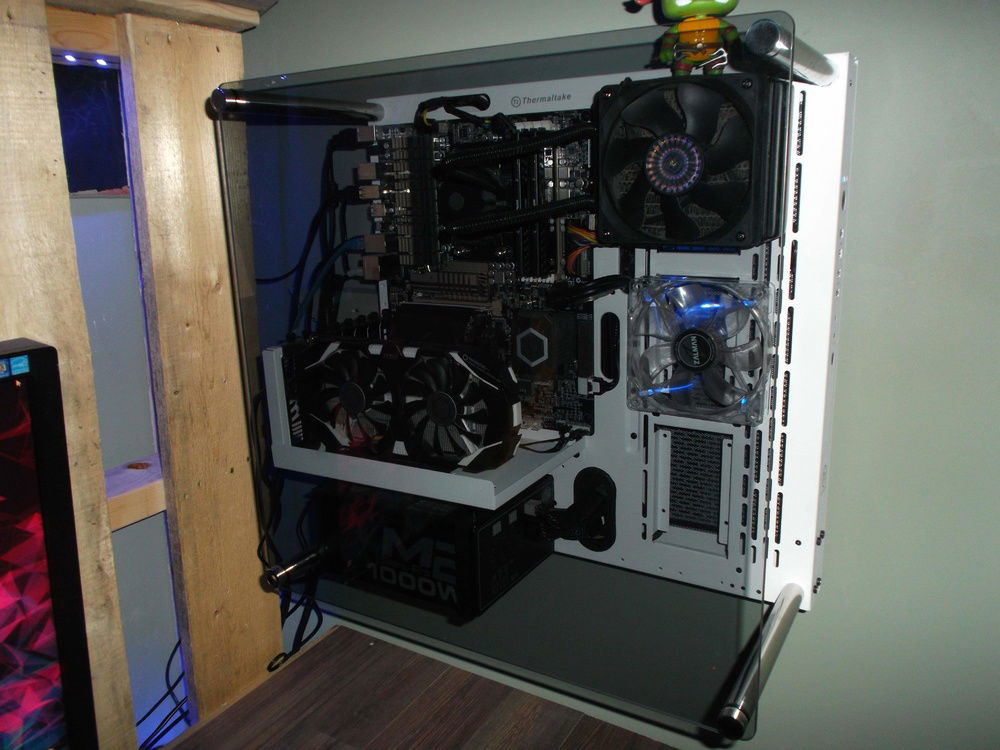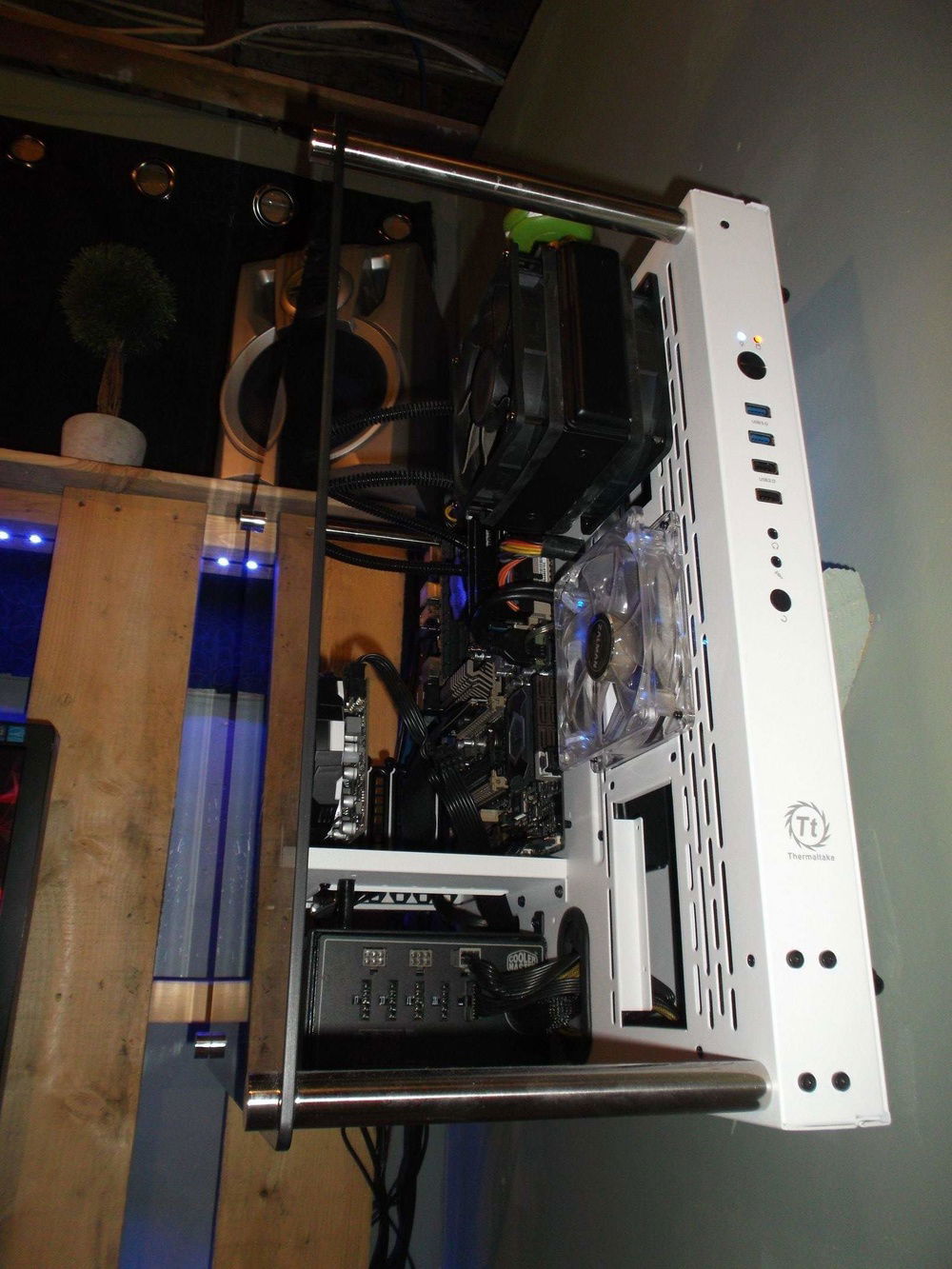 Budget build. Has white black an camo brownish beige colors. Its wall mounted with back rgb lighting cant tell. Cause of camara flash. Diy desk also