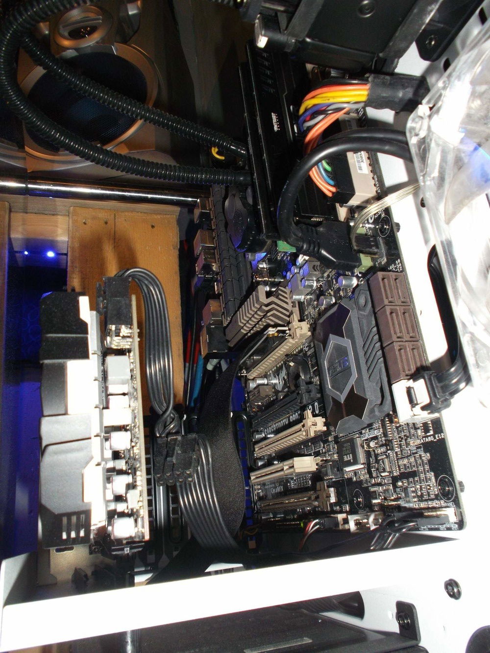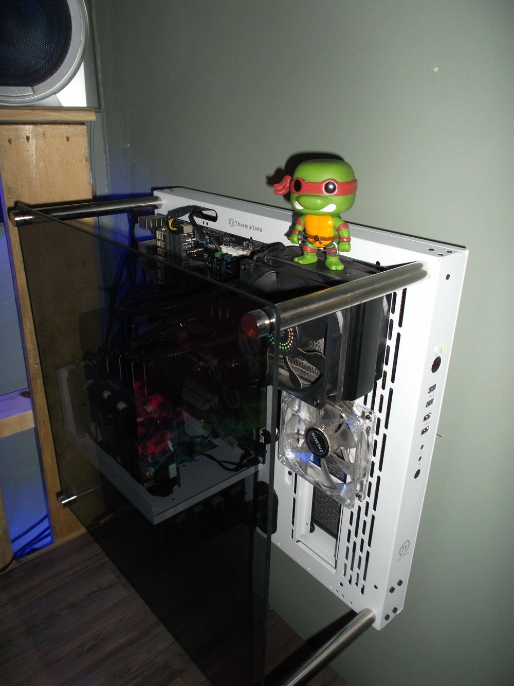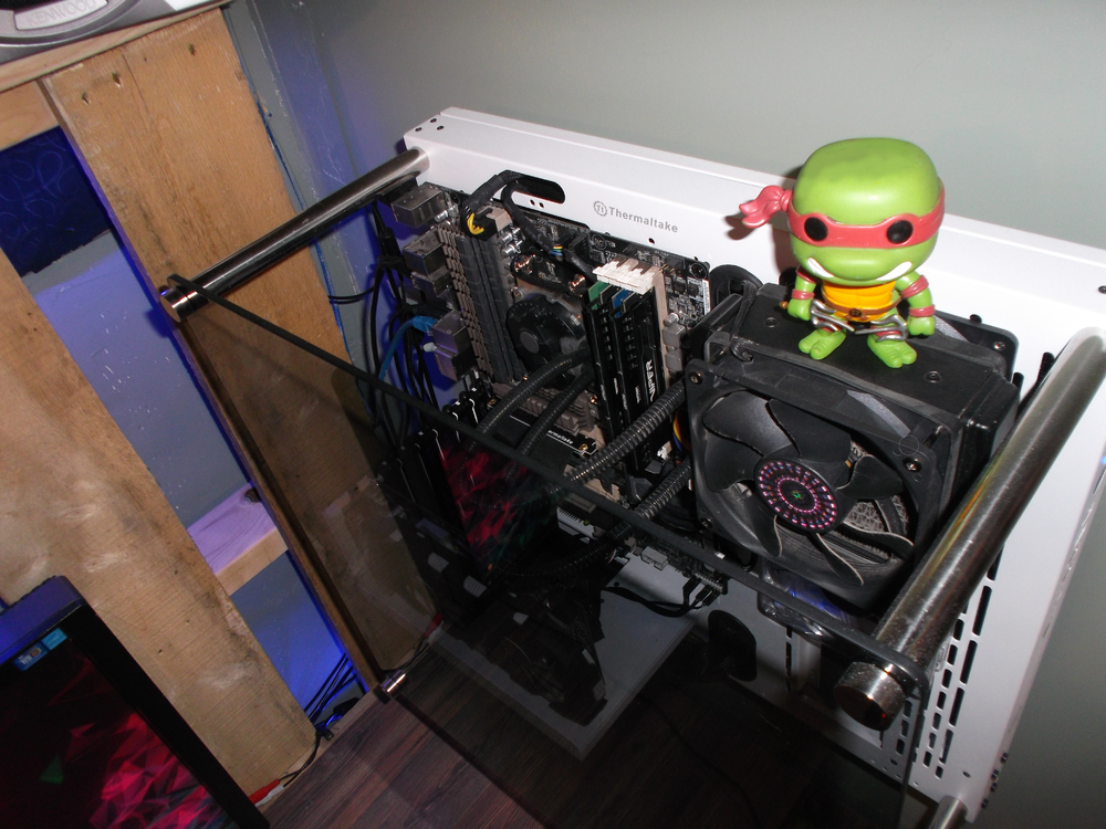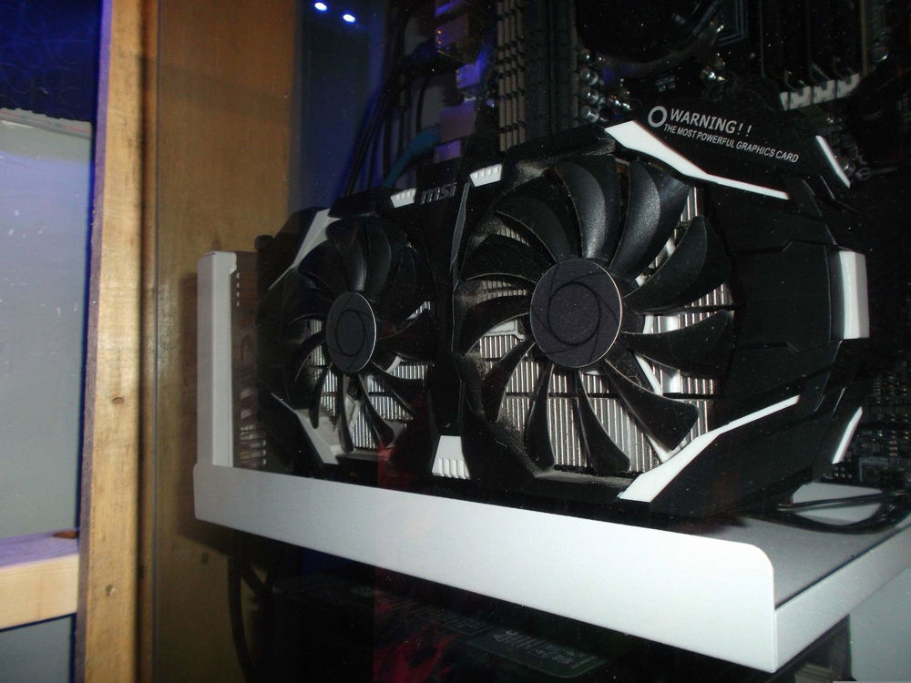 Budget build. Has white black an camo brownish beige colors. Its wall mounted with back rgb lighting cant tell. Cause of camara flash. Diy desk also