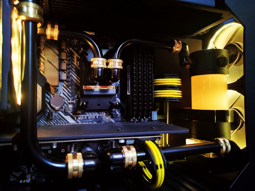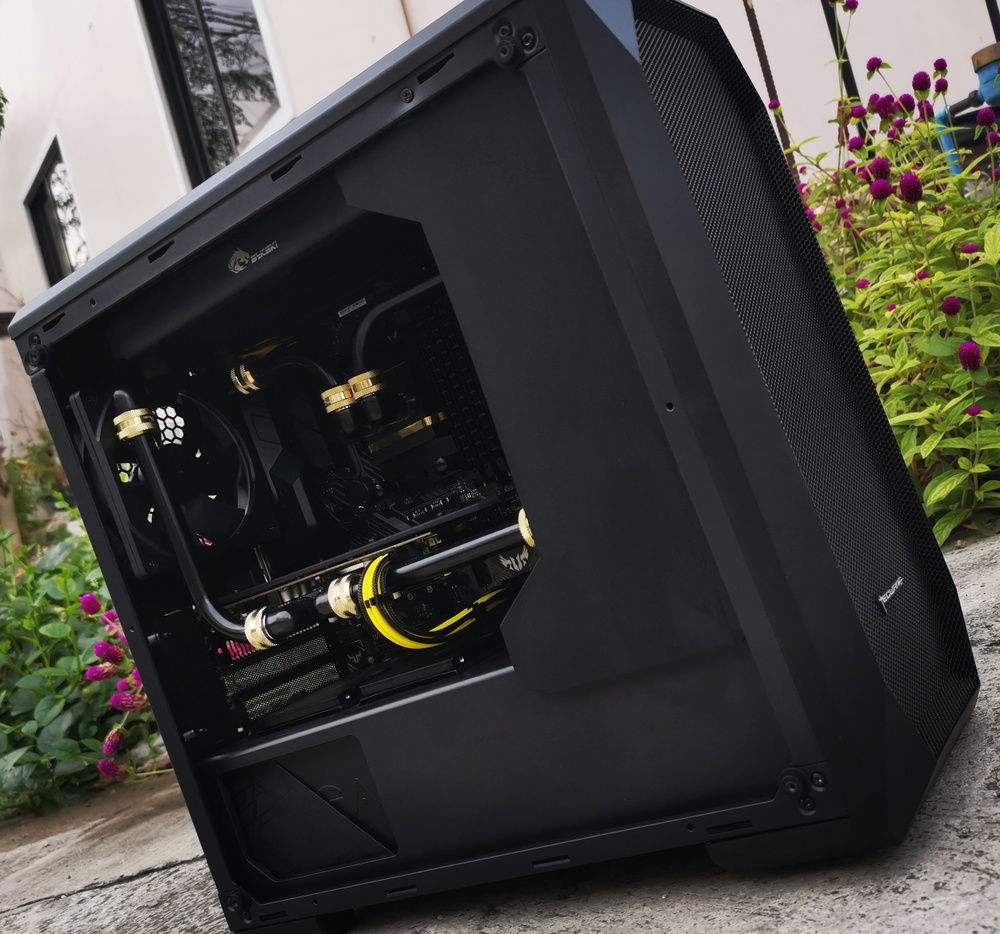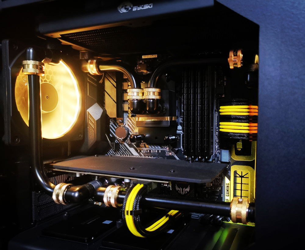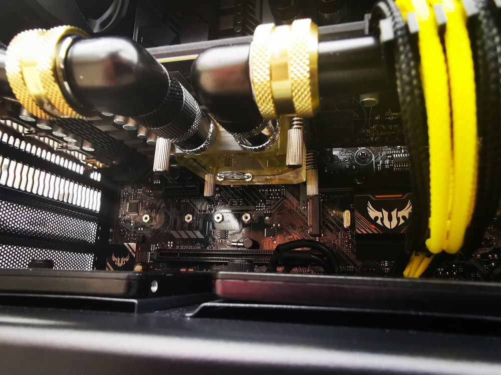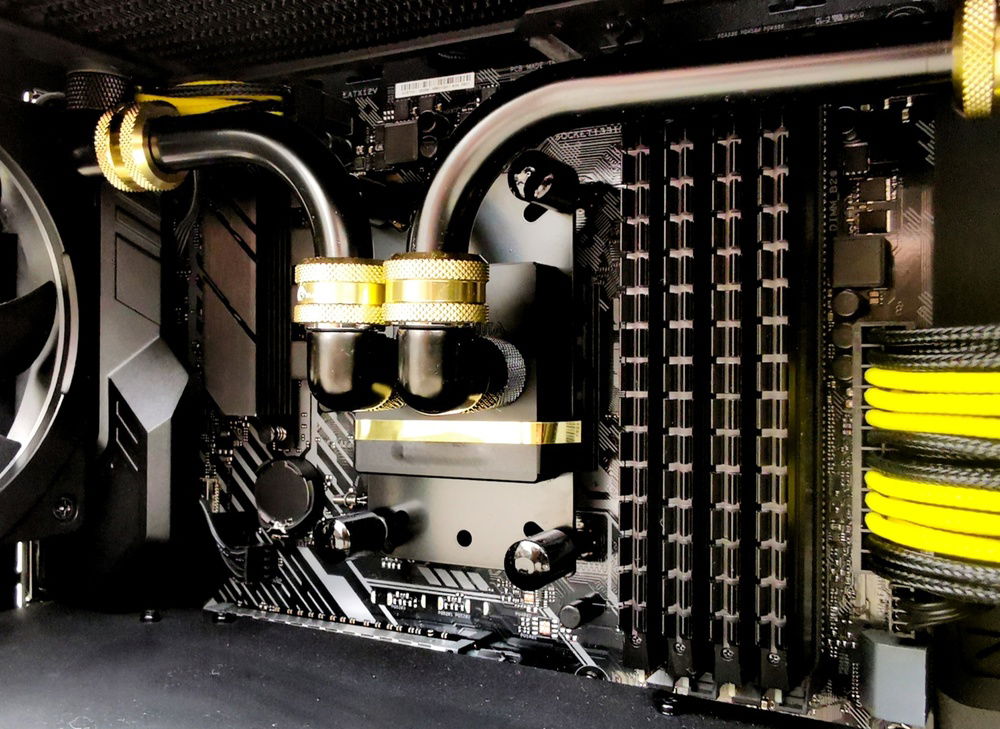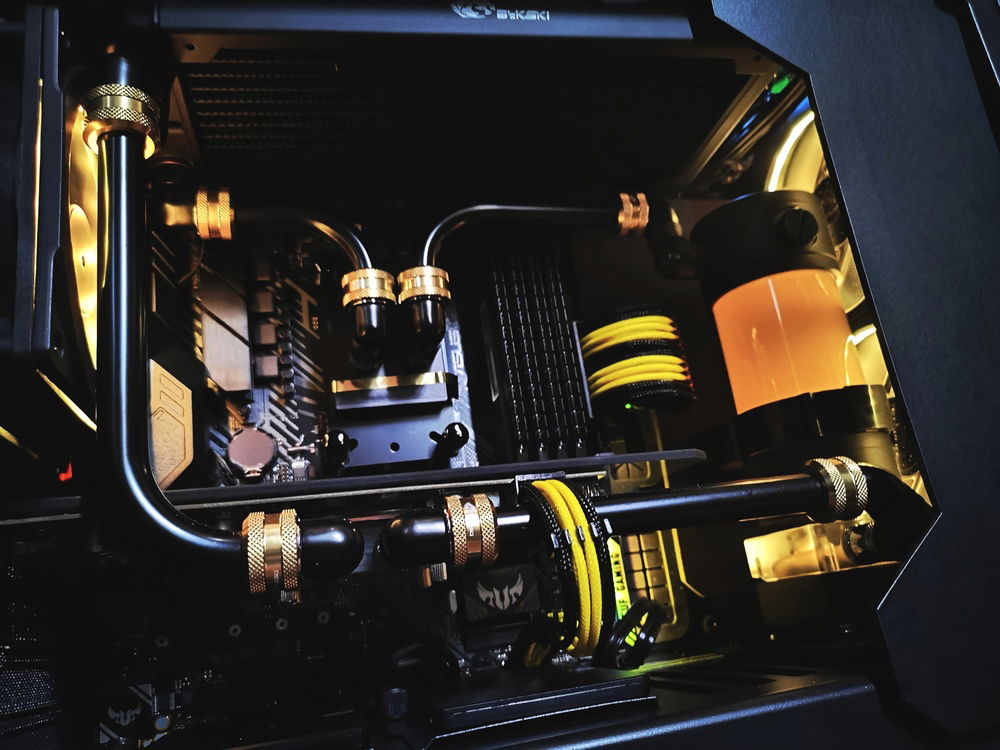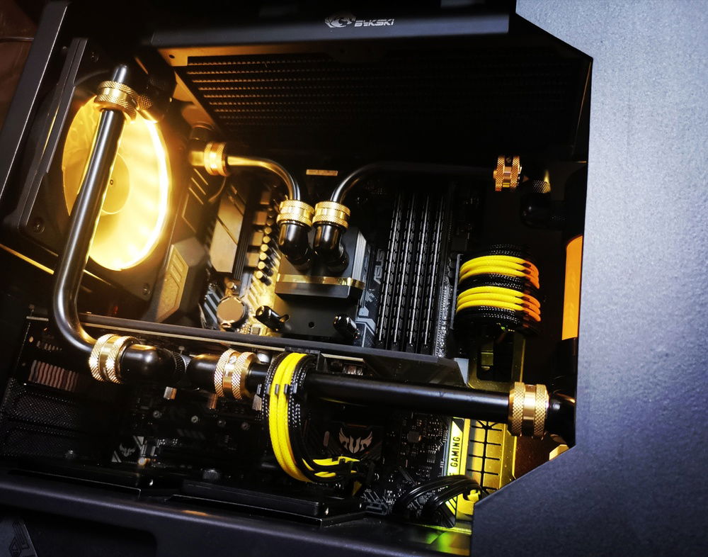 Since my son is complaining that his previous rig is slow in some games, I decided to upgrade is rig to highlight the new black-plated brass tubings from Bykski and pair them with Bykski's gold fittings as well.