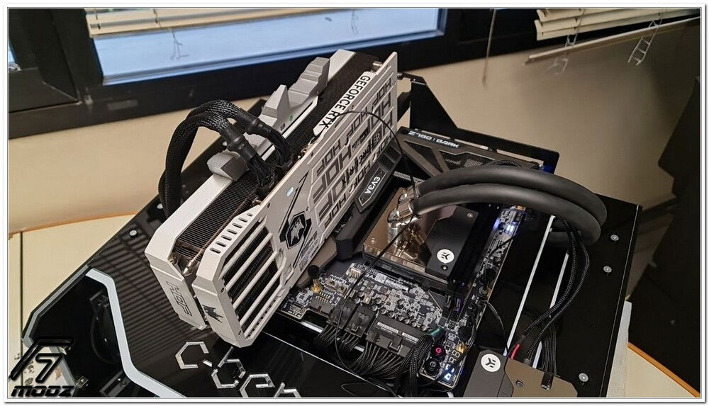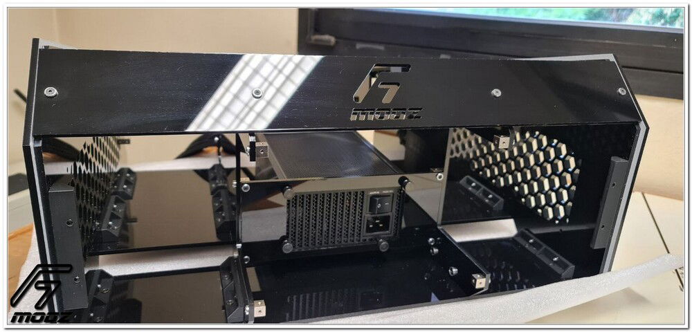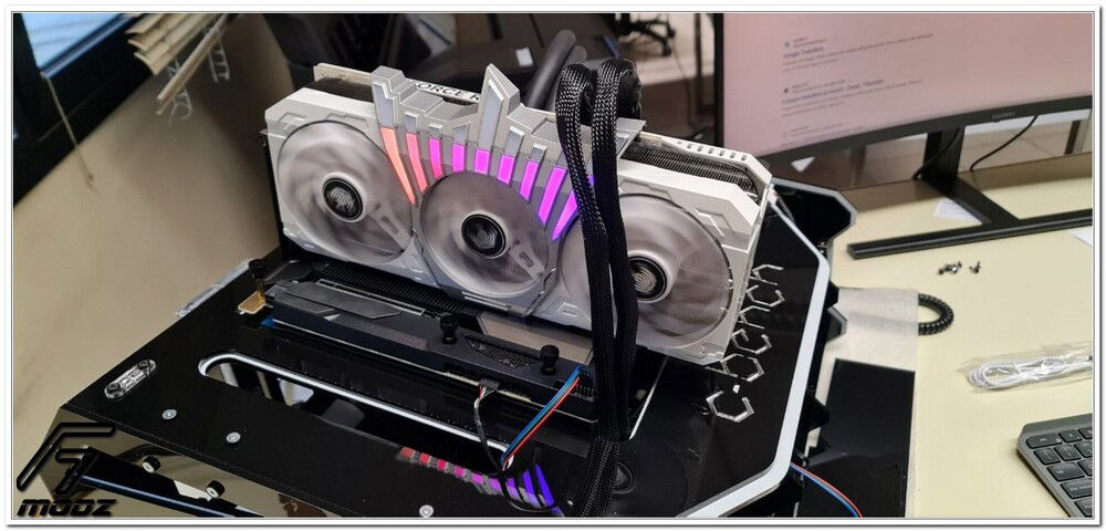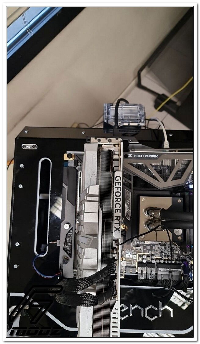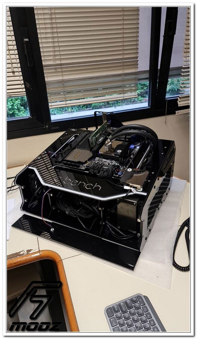A custom bench with support for 2x360 rad 72mm + push pull, and a 360 distro on the back