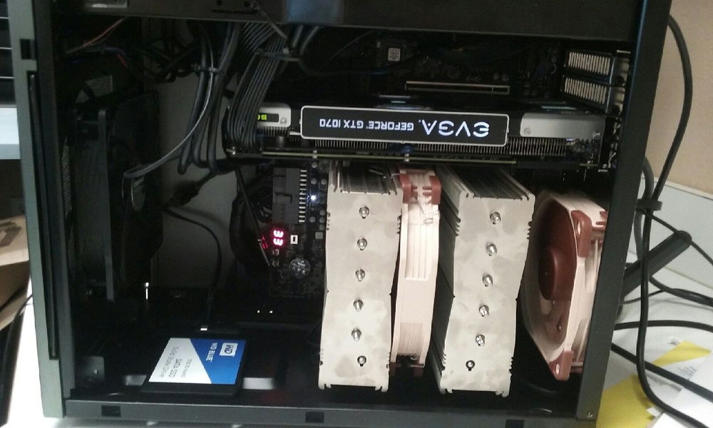 This build is to replace my bosses aging laptop. For our work we use AUTOCAD Civil 3D and Arc GIS quite regularly. Both of these programs scale well up to 12 threads but they are heavily dependent on clock speed so the 8700k was chosen over AMDs comparable offerings. A good GPU helps render the maps we use so I selected the 1070. We could have gotten by with a GTX 1050 but we didn't want to need an upgrade for a while. The 8700k is at 5 Ghz on all cores at 1.32V and the GPU has a +75 on the core and a +150 on the memory. CPU maxes at 68C under stress testing and the GPU hits 70C after an hour of Heaven benchmark. The case was chosen due to its smaller stature and decent airflow. We travel to meetings so having a system that is portable was very high on the priority list. My only complaint with the case is due to the inverted motherboard layout combined with 90 degree pins on the motherboard instead of vertical ones getting everything hooked up was quite a pain. All the fans in the system were swapped to Noctua ones to help move lots of air but not be oppressively loud.