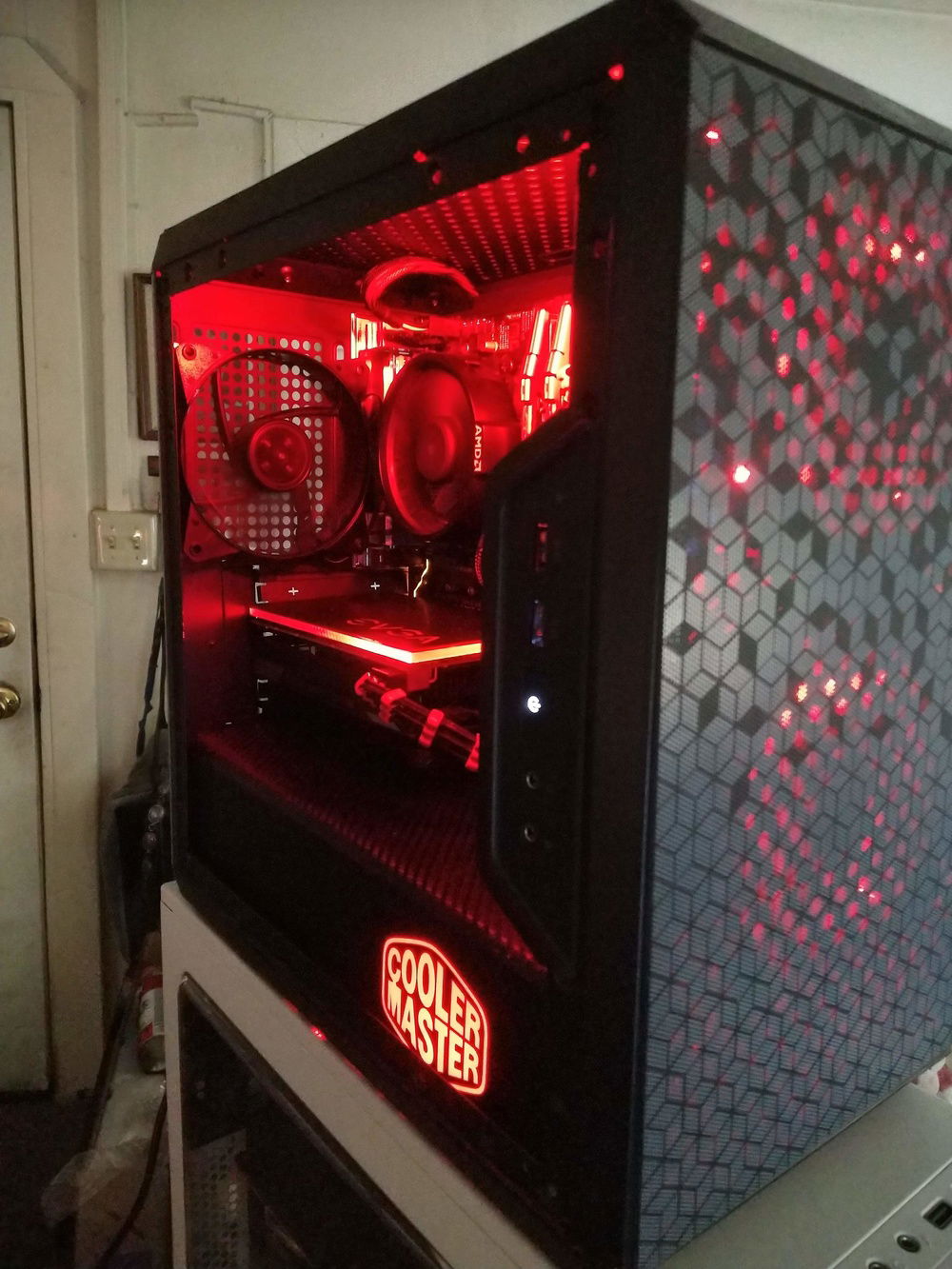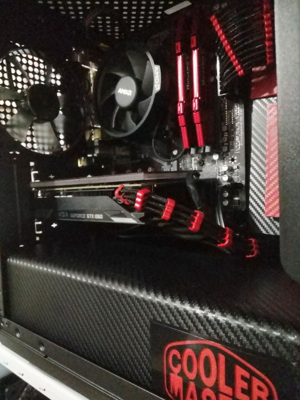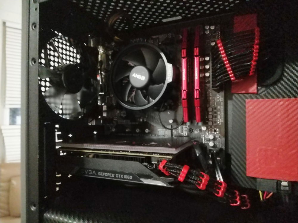 Customer build. Custom gpu backplate custom backlit inside panel and psu shroud. all vinyl wrapped in black and red carbon fiberrrrr