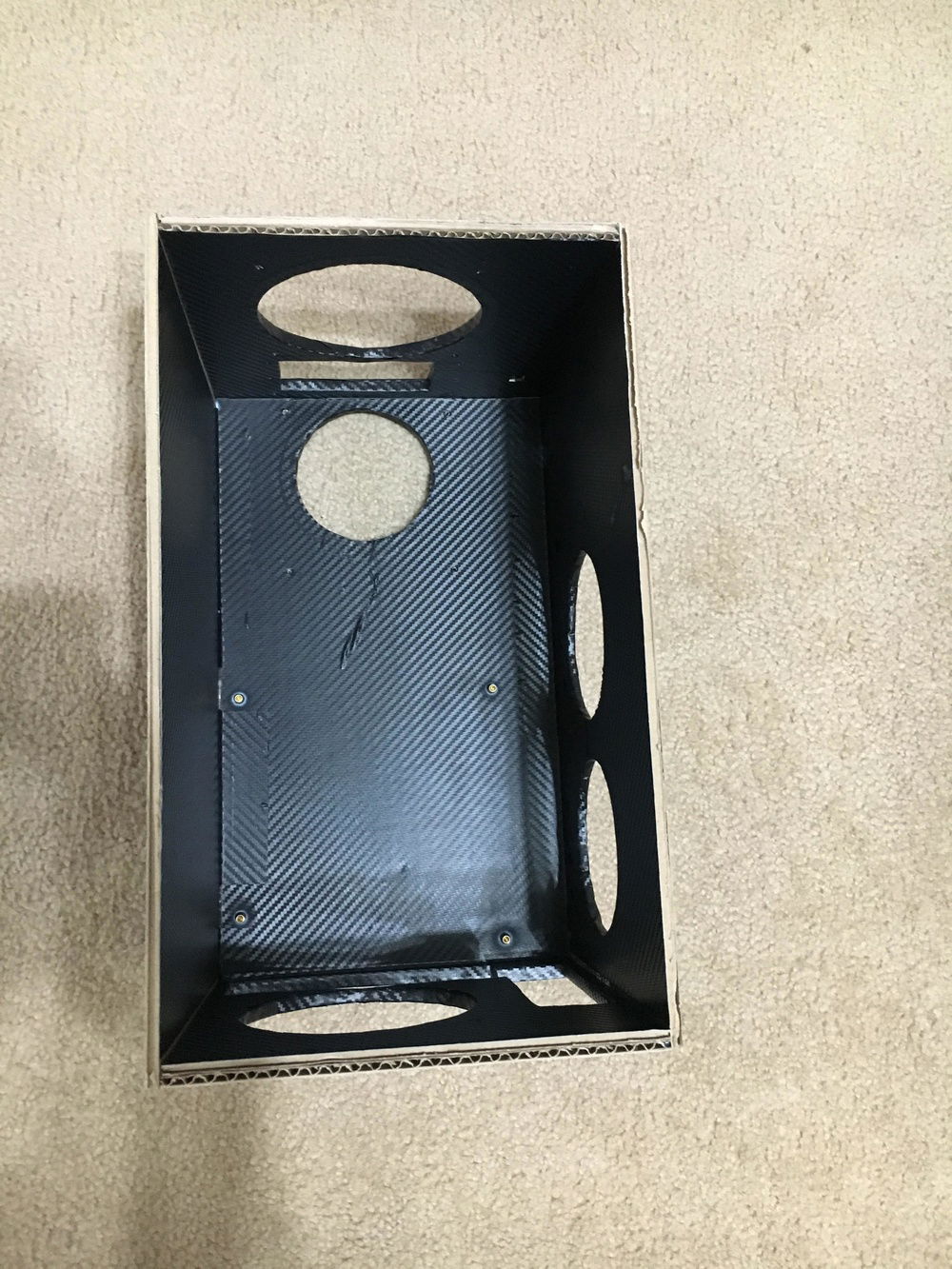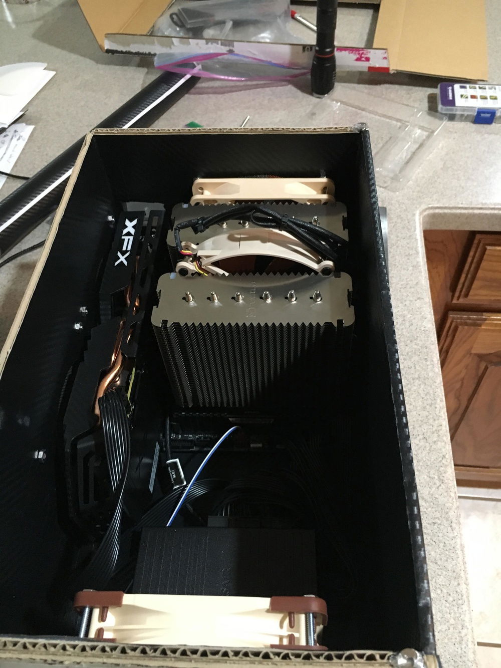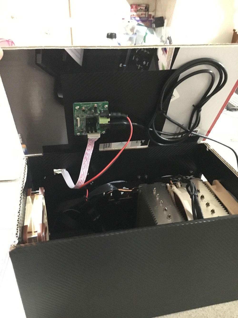 Hi everyone! Isobethehen here with a new build for the winter break. You might have seen my old build that I attempted in the summer of 2017 that used acrylic. https://imgur.com/a/AY2mr This time, I wanted to go super cheap and make a case out of cardboard. I also recycled a laptop monitor from a previous project here https://imgur.com/a/kzHivK1 It came together very nice and there are no thermal issues which was my biggest fear. Some of you might say something about fires and stuff because it is made out of cardboard but the inside is completely lined with the vinyl which is a insulator and unless there are any sparks flying out the case, it shouldn't spontaneously combust.