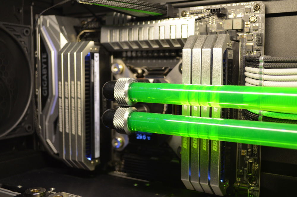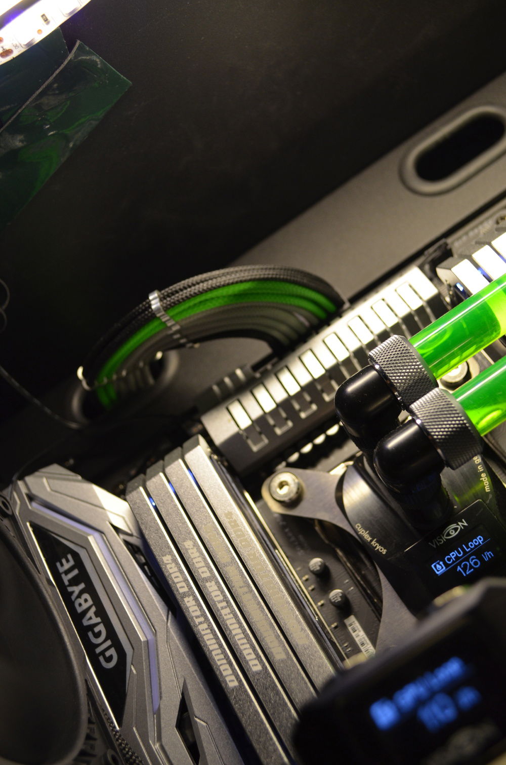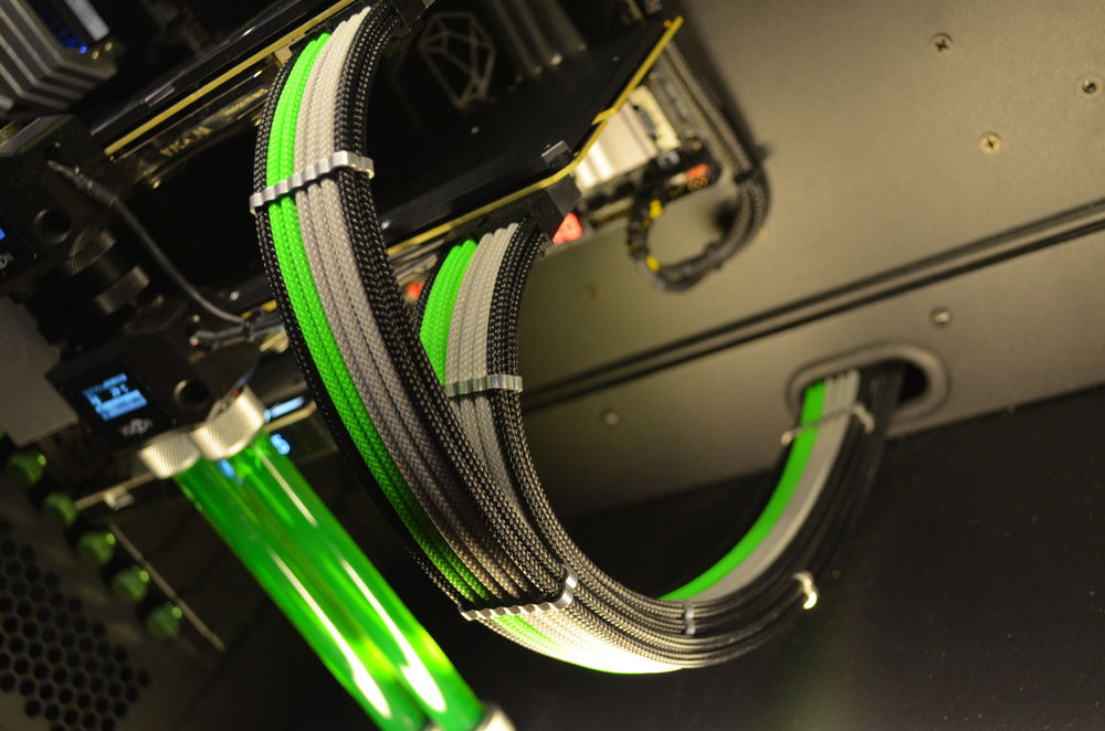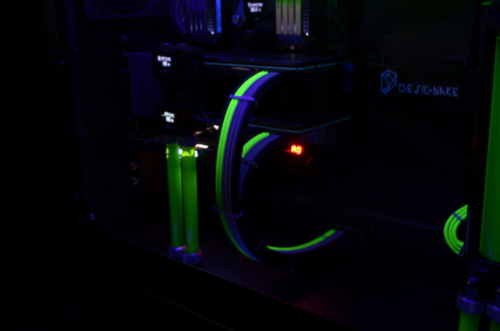 Cables are made from scratch using AWG 15 wires and MDPC-X sleeving along with aluminum cable combs. Visible tubing is Mayhems 16 mm OD borosilicate glass. Fittings and pass-throughs by Barrow.