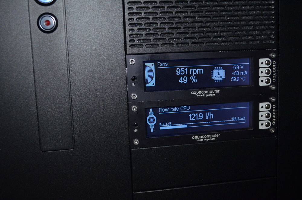 Fans are spinning only at 500 RPM that's why I went for not expensive Arctic ones. Load temperatures don't exceed 40C on GPUs and 55C on CPU. Each loop has two Hardware Labs radiators.