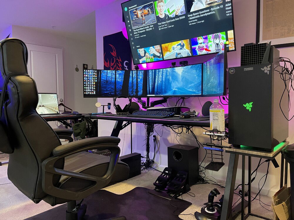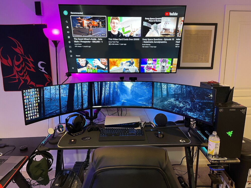 My dream build. Almost no compromises. RGB Focused. Not happy with the cable management; so I still have some work to do. This build dose not include the living room area you see there to the left. On the desk to the left of the triple monitor set up is my MacBook and iPad I use for my busiess. I have an Apple TV Mounted to the underside of the desk to wireless extend or mirror my apple displays to the above TV. The TV above also has my PS5, and Xbox Series X attached for any option or combination or work and or play. This is my Command Center. Welcome.