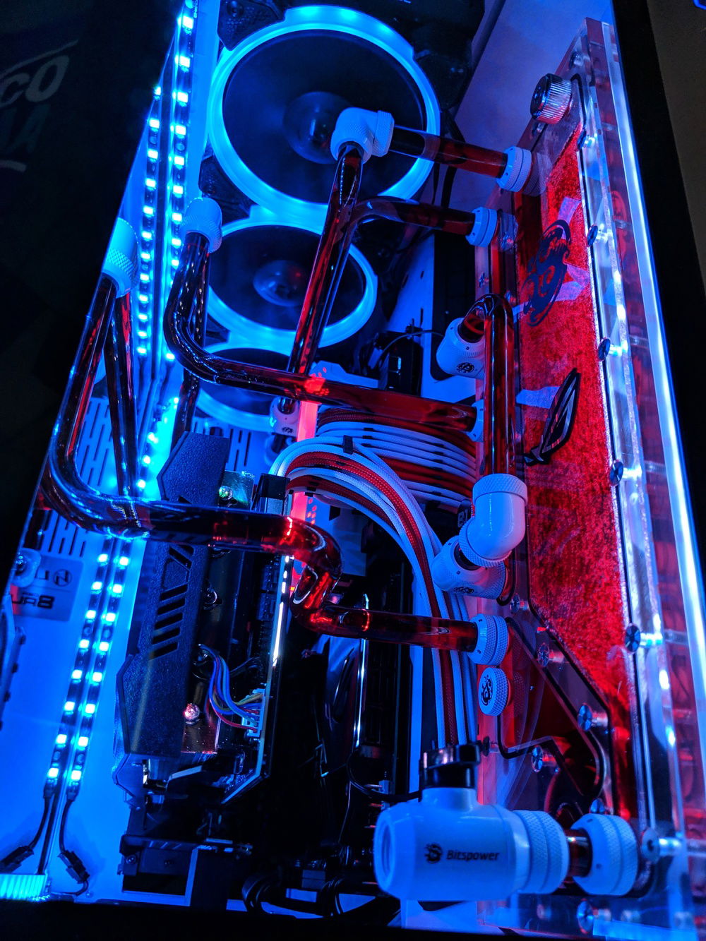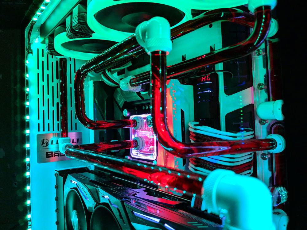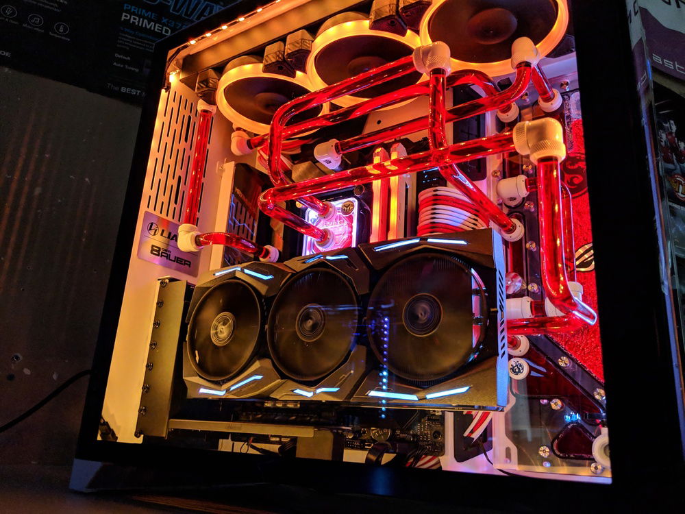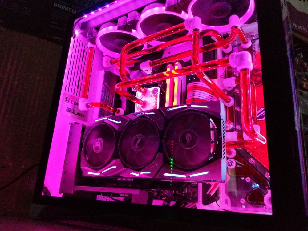This is a watercooled Lian-Li PC011DX DER8AUR Edition. White and Red themed, with a custom distribution plate from bitspower.