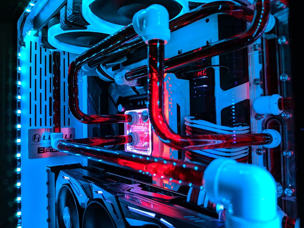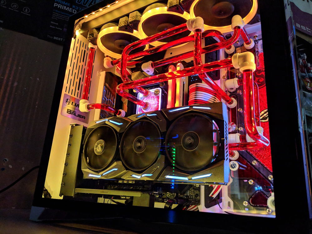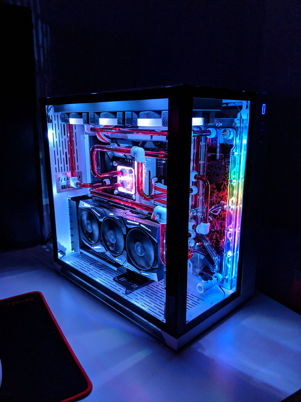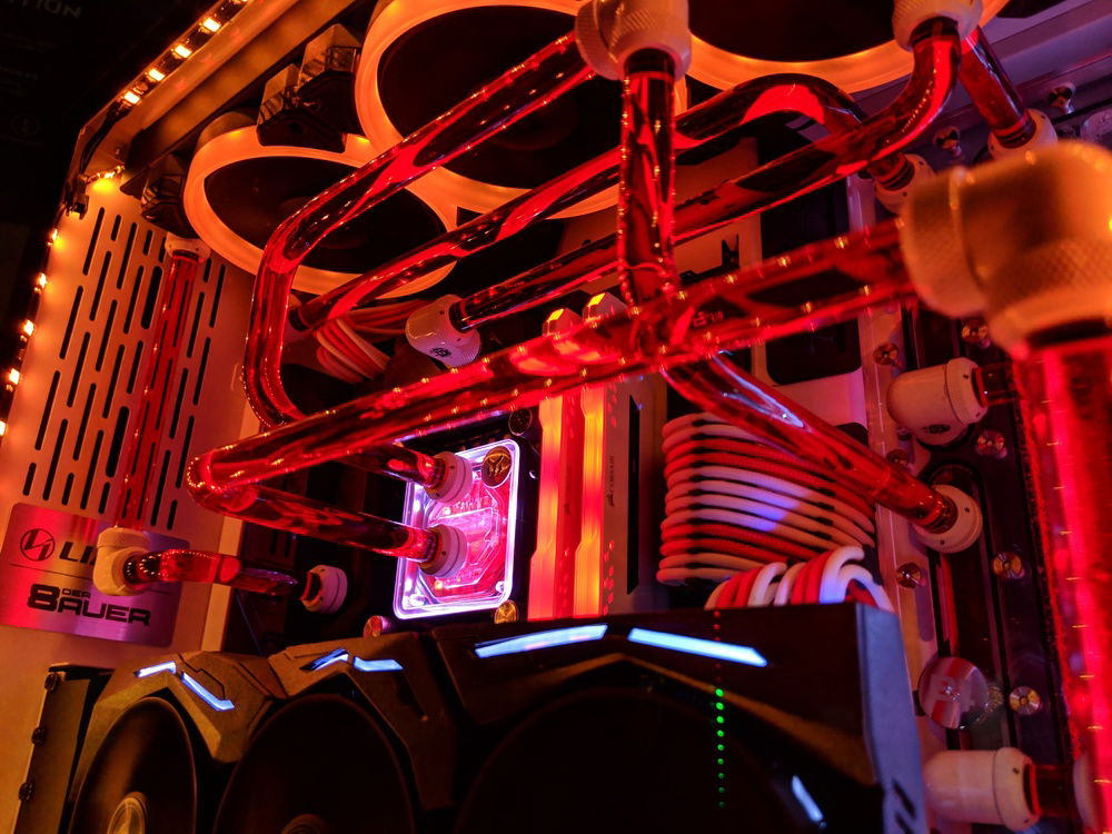 This is a watercooled Lian-Li PC011DX DER8AUR Edition. White and Red themed, with a custom distribution plate from bitspower.