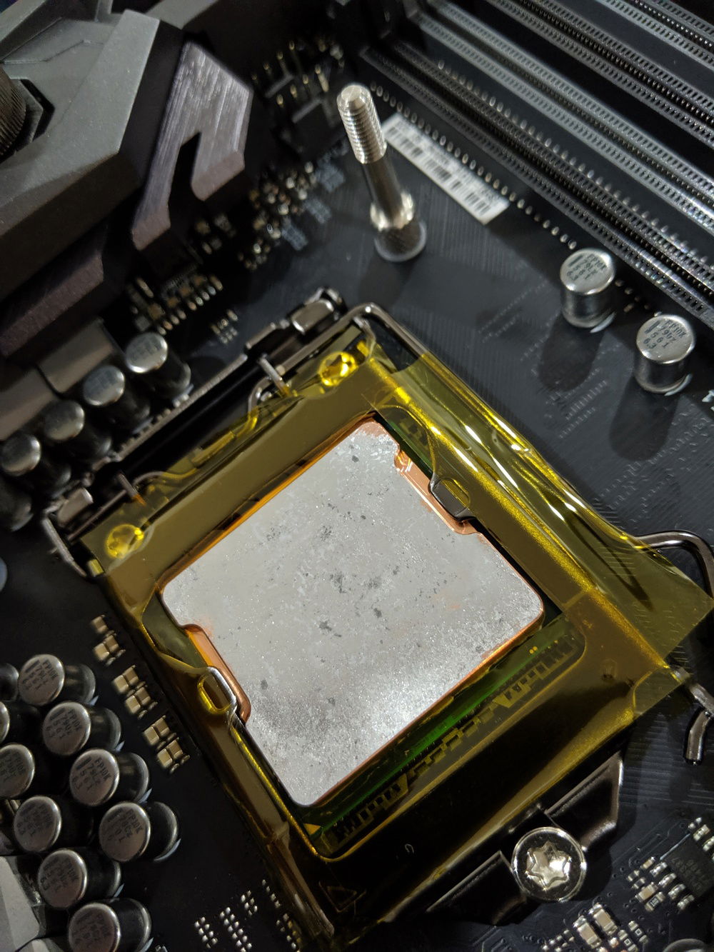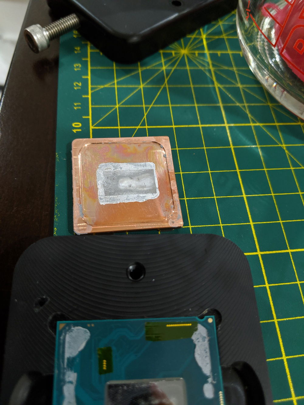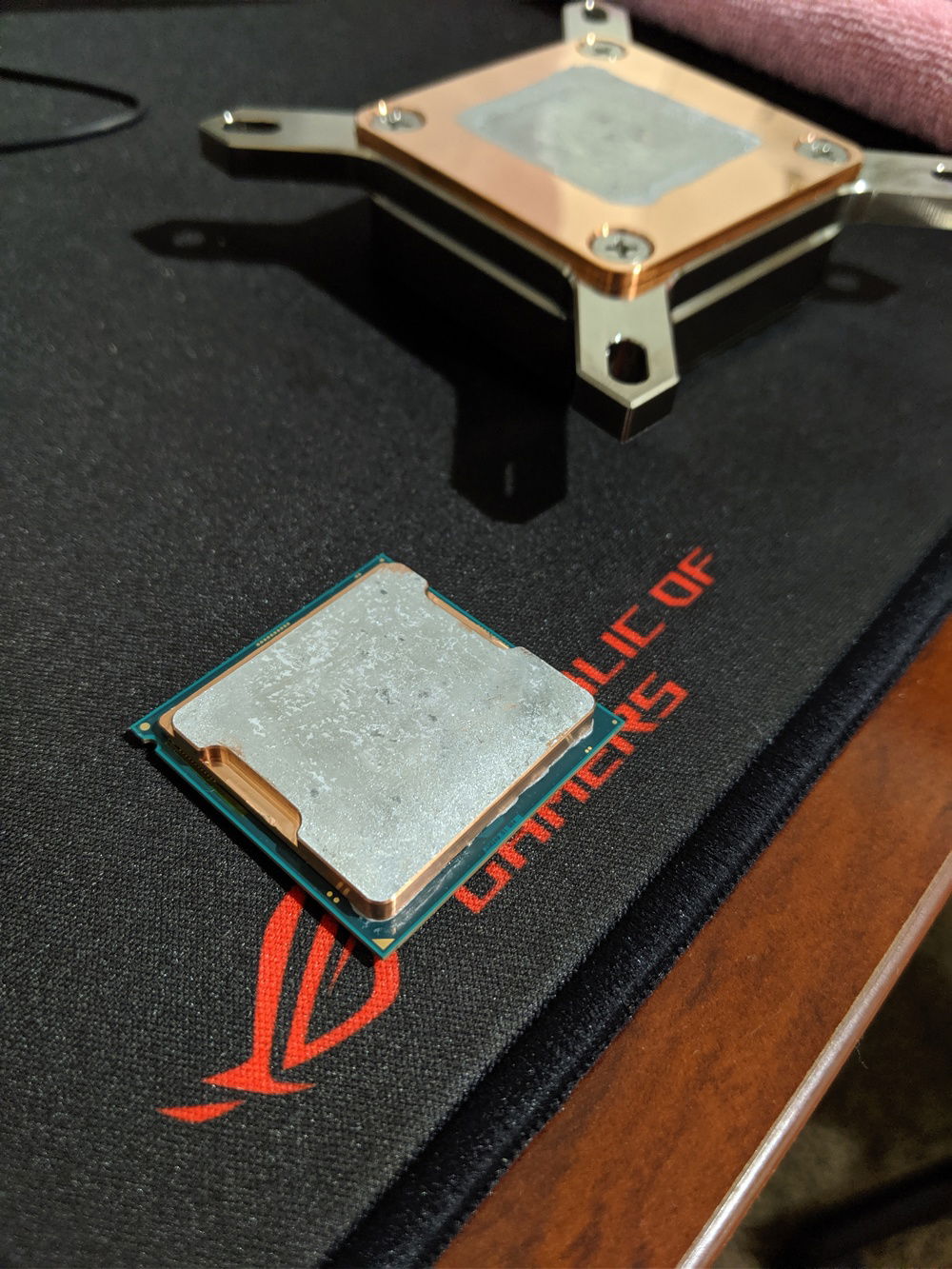 The liquid metal bonded between my Rockit Cool IHS and the cold plate on the CPU waterblock. My temps really started to spike.