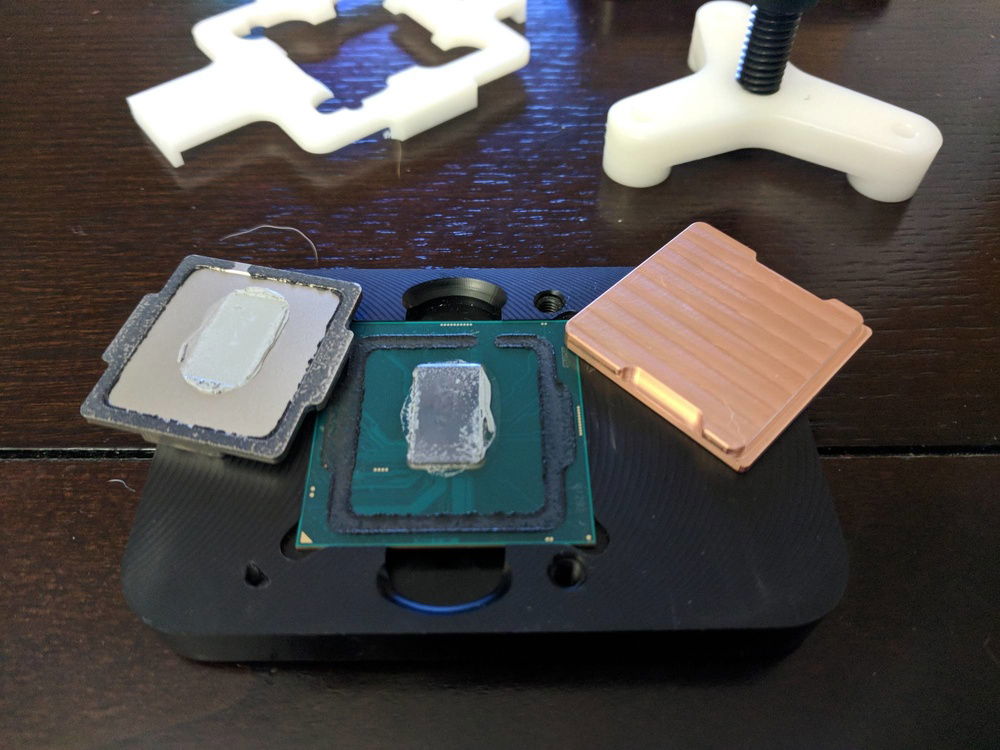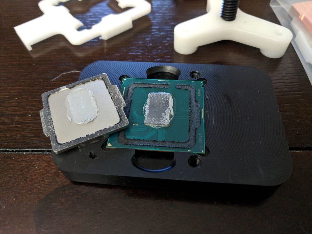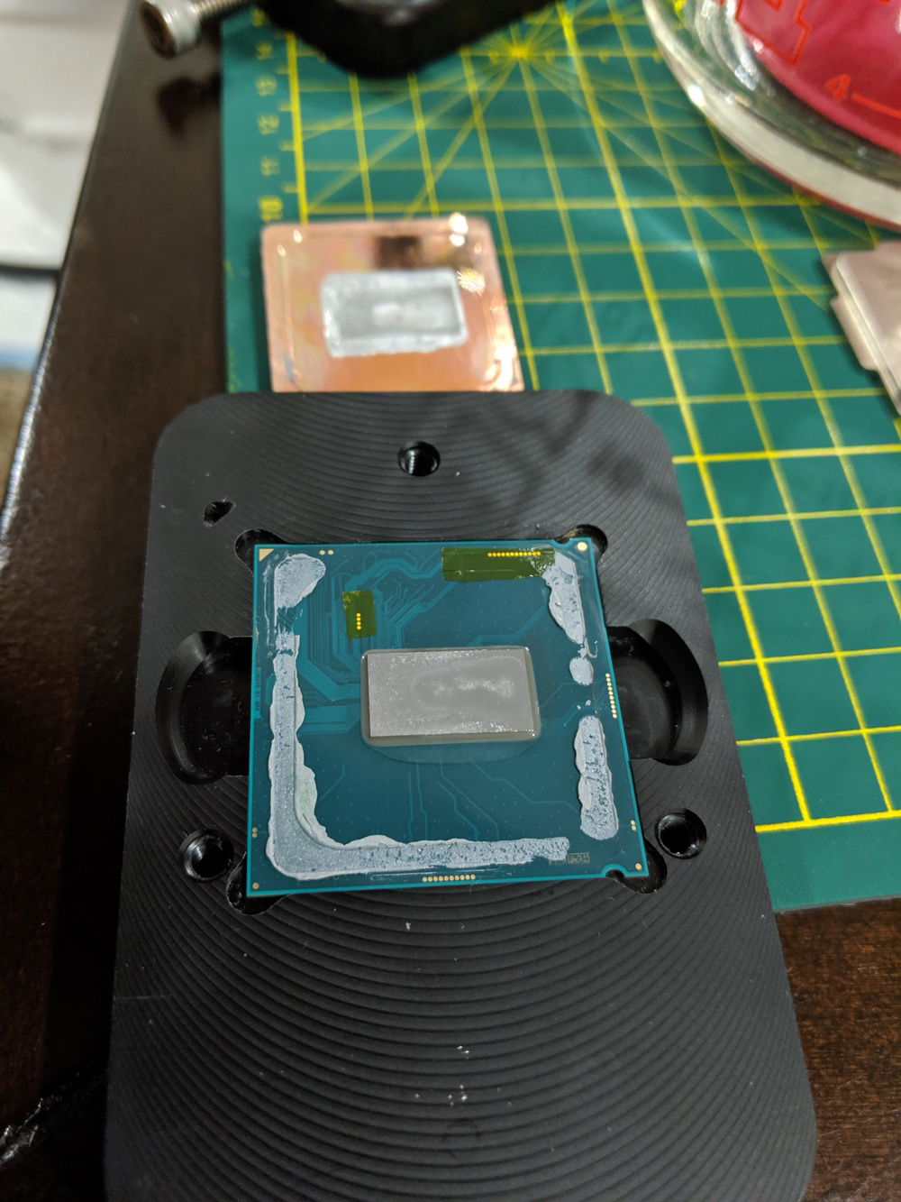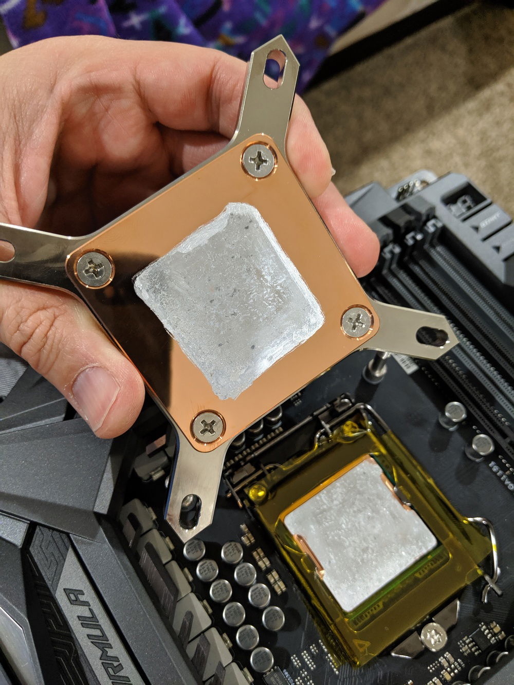 The liquid metal bonded between my Rockit Cool IHS and the cold plate on the CPU waterblock. My temps really started to spike.