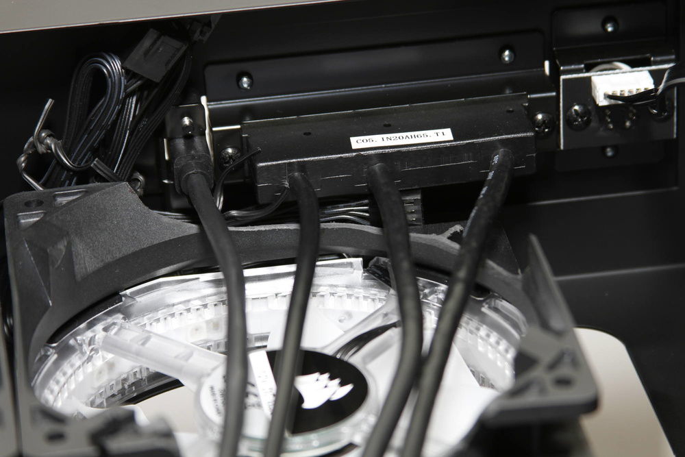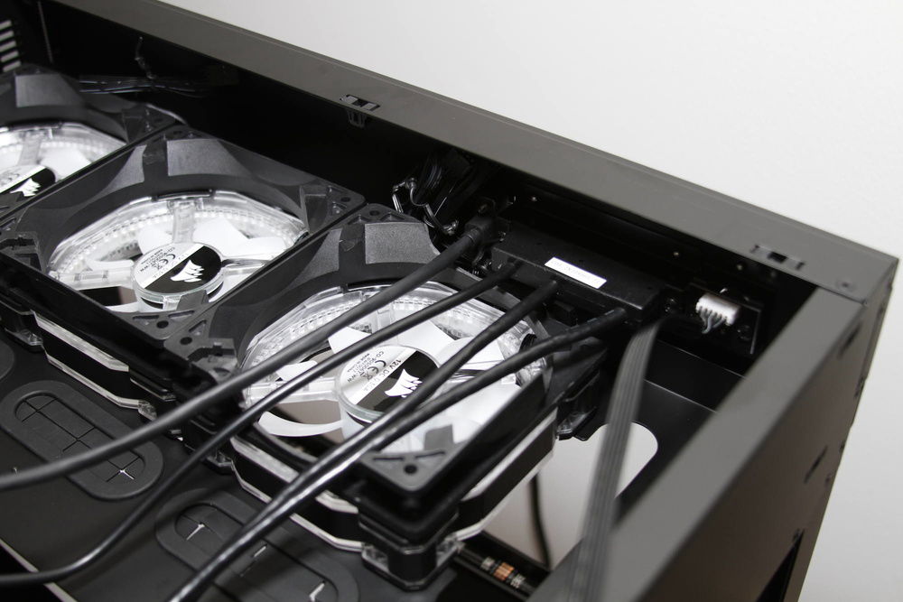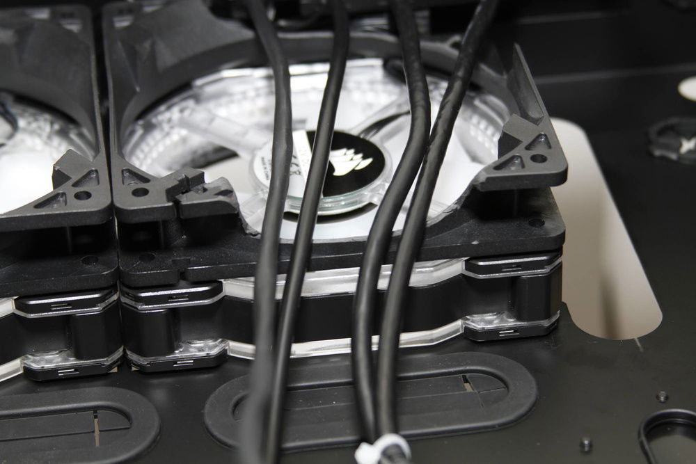 You can see the front panel cables and how they obstruct the fans and radiator. I had to make a cutout of the fan spaces to route the cables. Some folks have just bent the cables, but I wasn't comfortable doing that.