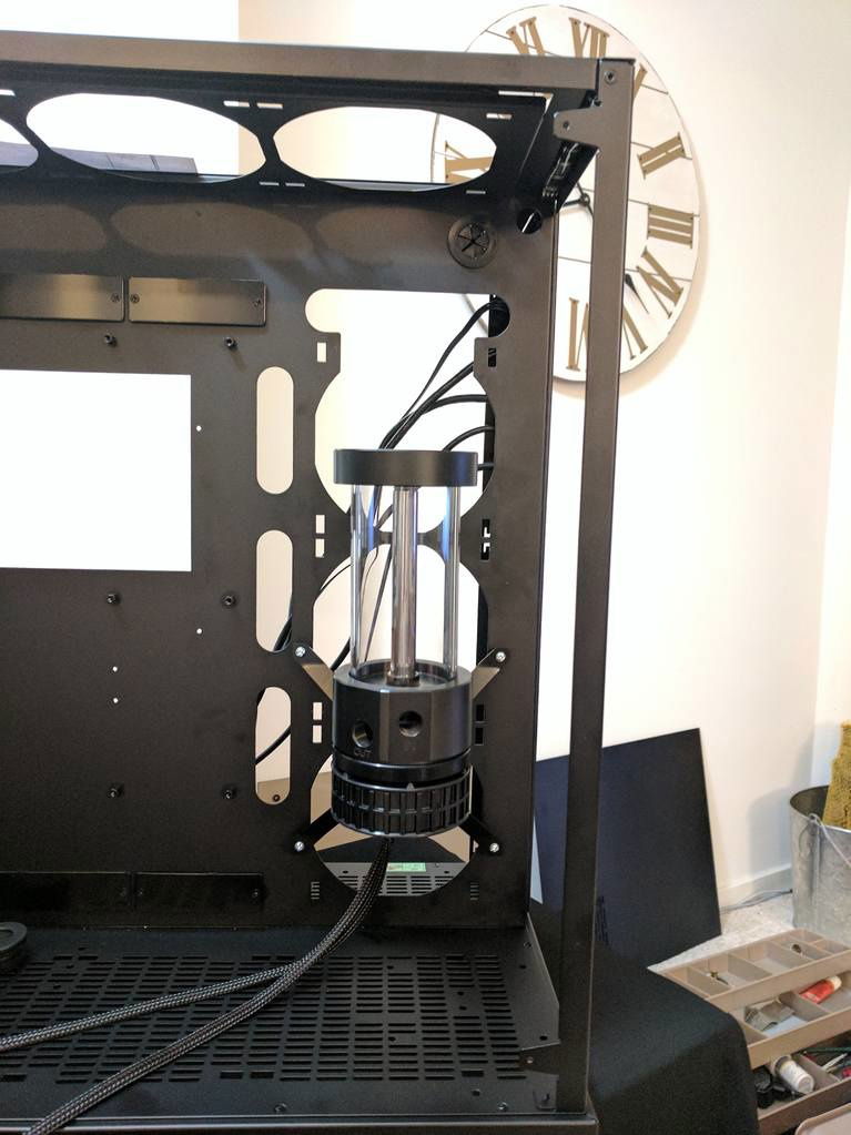 I mocked up the assembly for the pump. I'm using a 140 fan bracket because I didn't want to be limited by the fans for pump placement. I also wanted to clear the custom fan grill.