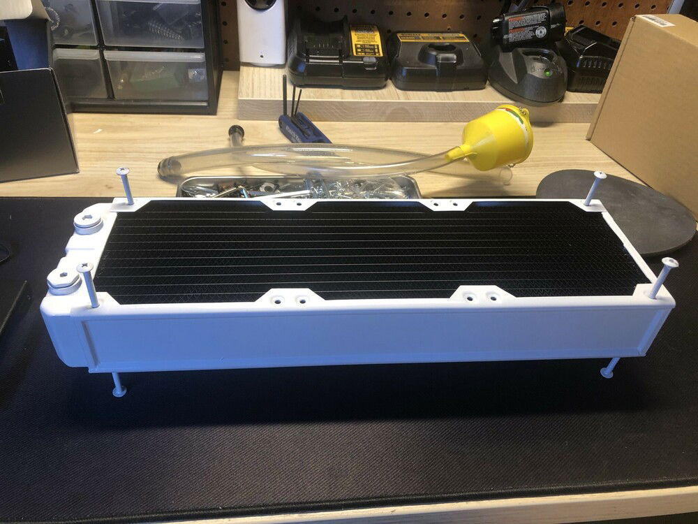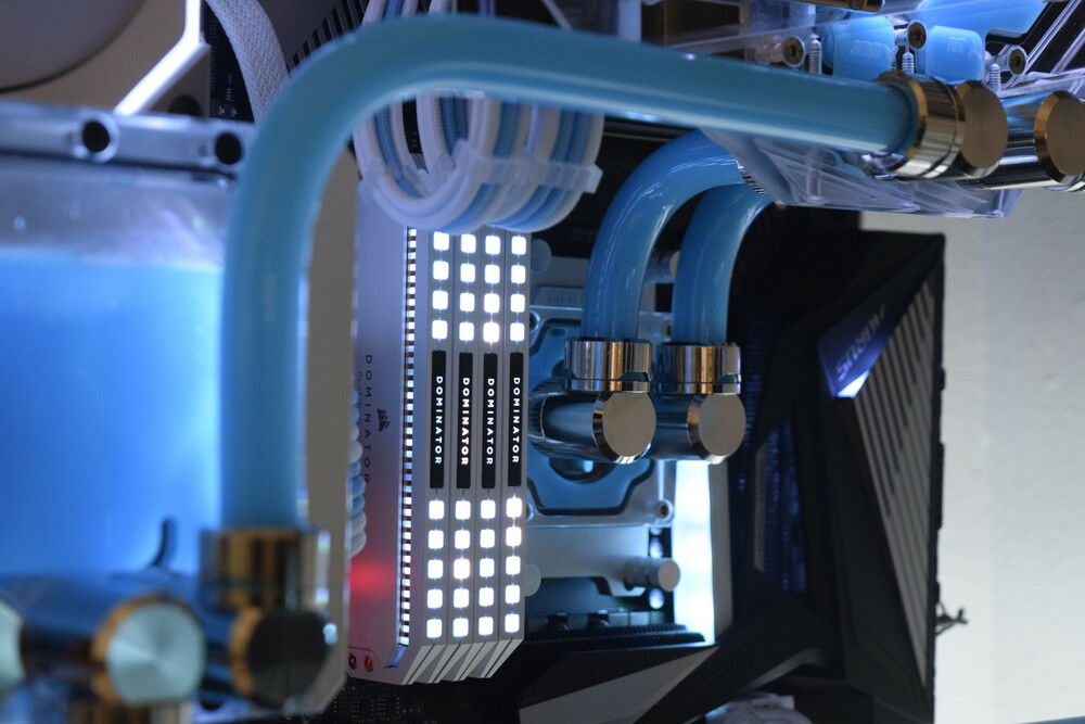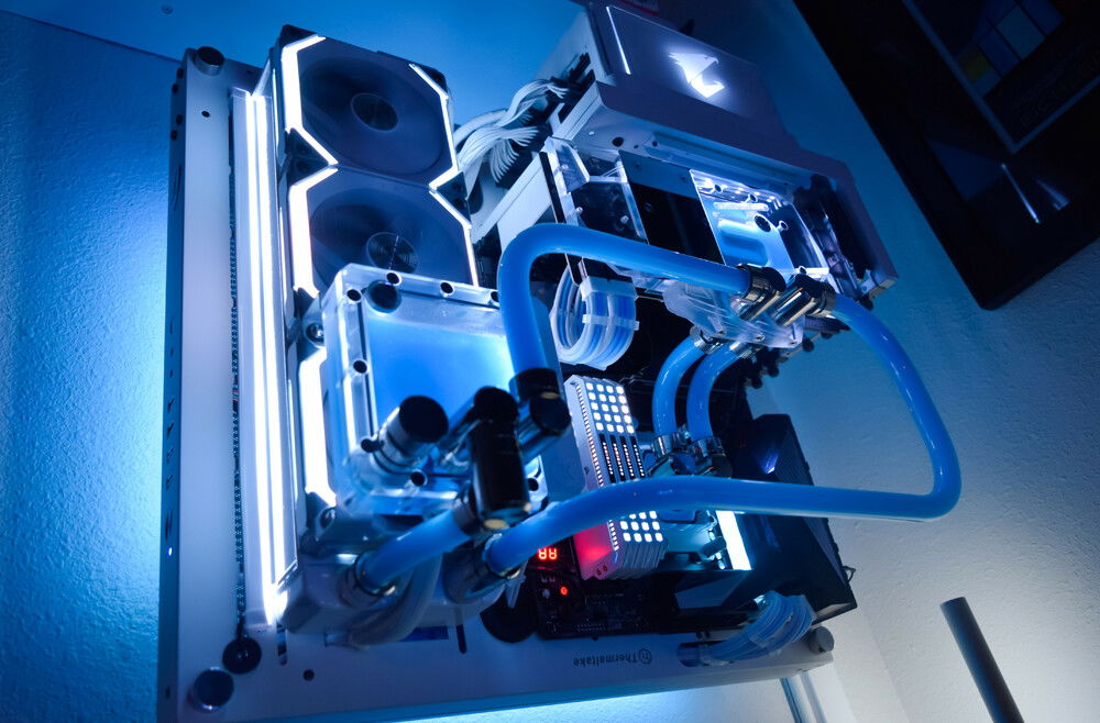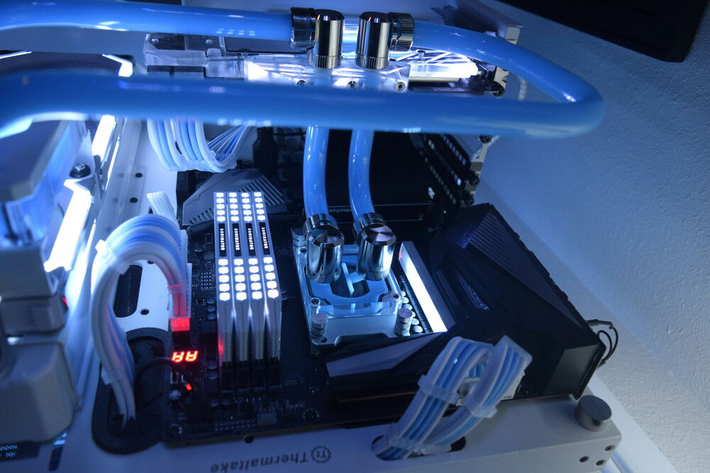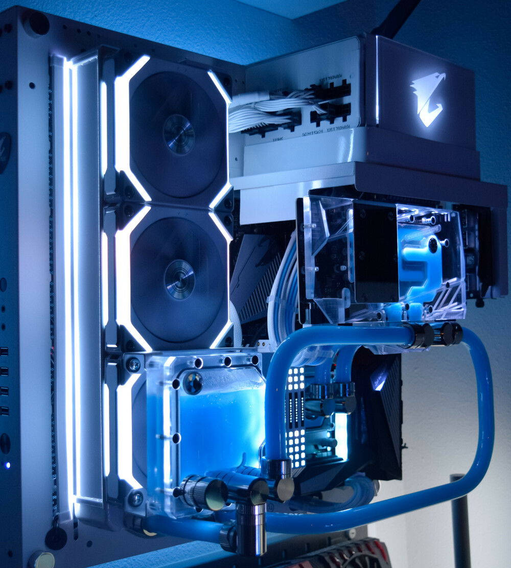 I wanted to do something different for my workstation build, as well as conserve my desk space. The name says everything about the theme. To keep the theme throughout the build, I painted the rad as well as the FLT 120 trim white. To break the monotony of the all-white theme, I filled the loop with EK Azure Blue with matching PSU cables. For the mounting space, I wanted the rear IO to face the backwall and the front IO to face the front, so inverted the Core P3. I decided to not use the long metal pipes and the tempered glass to make this a true open air, wall mounted build.
