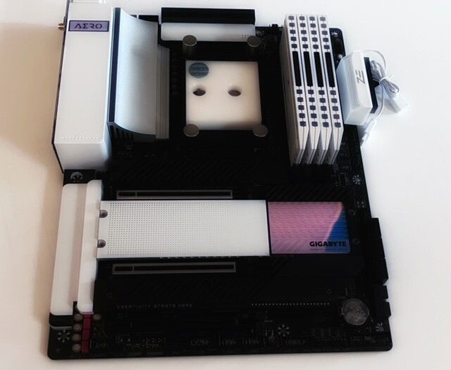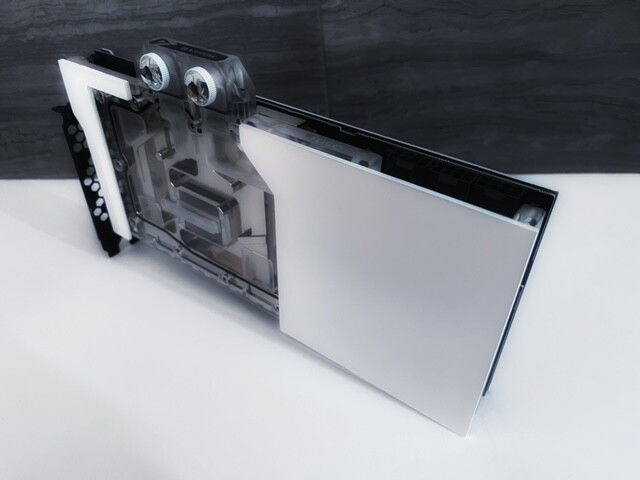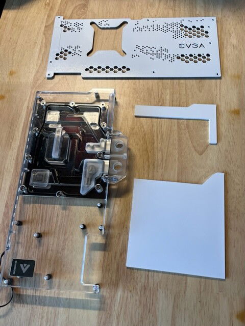 For the GPU, luckily I already had a block for the 3080, but the block top was clear acrylic, and I wanted more white coverage. I couldn't find any white GPU blocks for the FTW3 3080, so I decided to make my own white trim. Using 3mm thick cast acrylic, I cut out my design, spray painted it white. The acrylic trim will be affixed to the acrylic top. While I was at it, I used white automotive spray paint (to preserve heat transferability) and painted the GPU backplate to match.