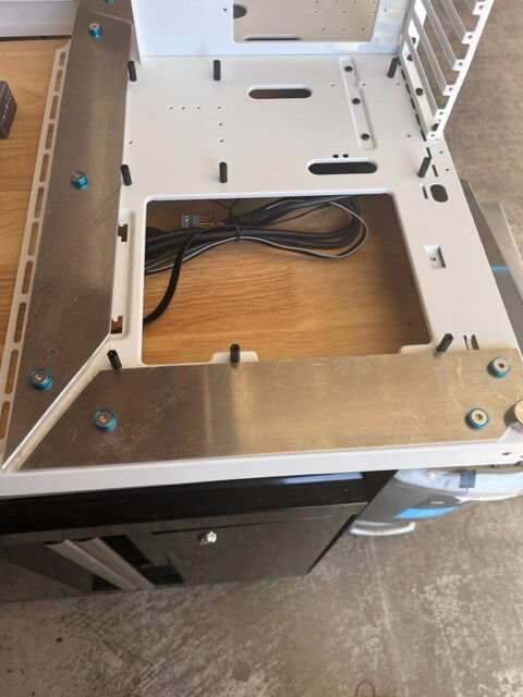 Since the aluminium trim was going to cover the grommets to run cables through, I raised the motherboard using 20mm standoffs. This allowed me to run the all cables under the motherboard.