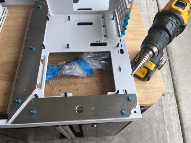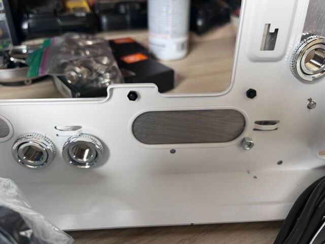I wanted to have cleaner tube runs, so I routed a large part of tubing runs behind the case. I drilled out additional passthrough holes through the aluminum trim and case, then installed passthrough fittings. I performed a final test fitting of hardware and the modded components before bending and installing tubing. Everything fit! It was time to bend tubing.