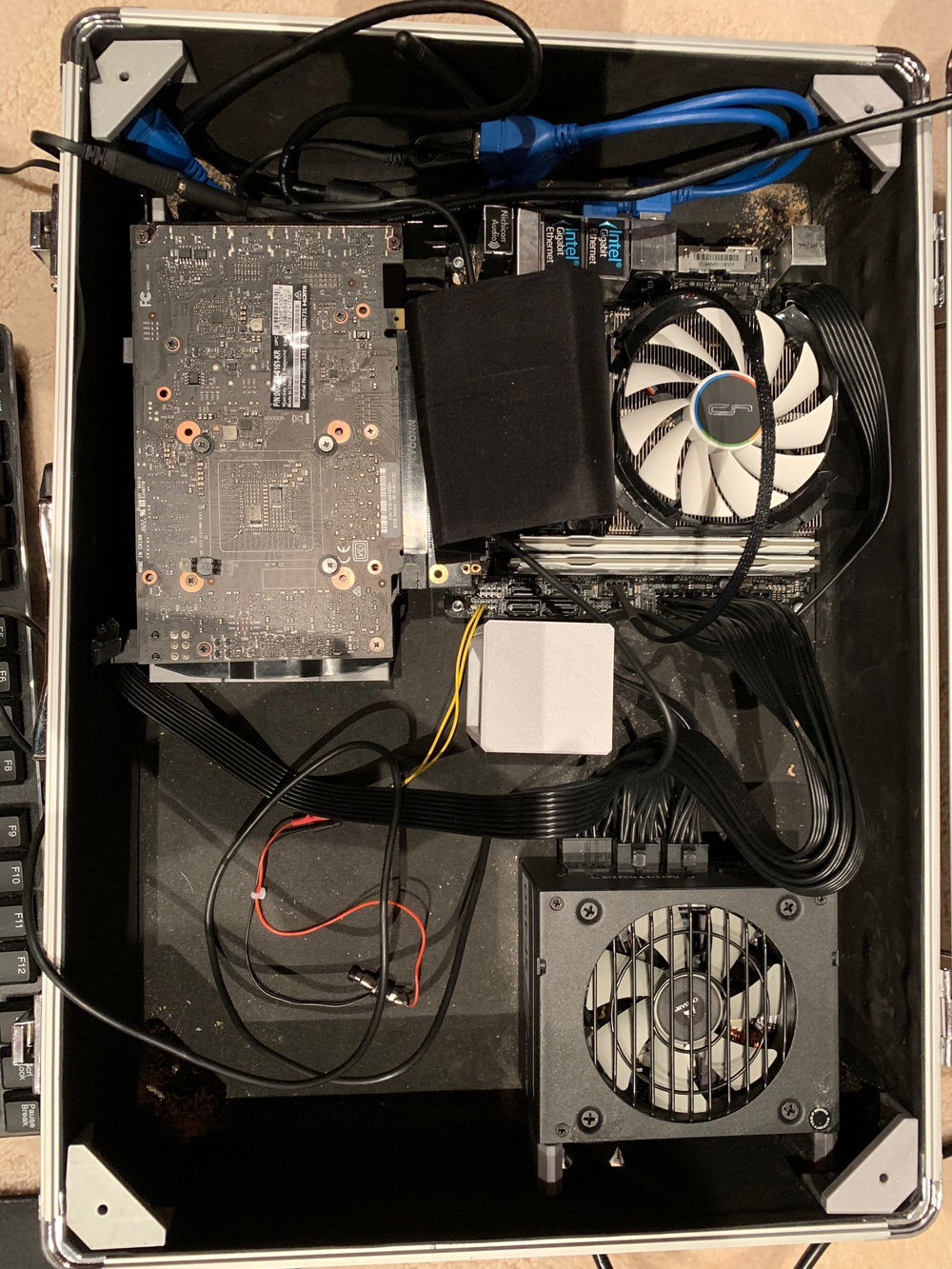 This is essentially a normal PC build but in a small briefcase. Most of the parts are mounted with 3D printed parts, screws, nuts, stand-offs, and a laser cut board. I designed this so that it would be as compact and easy to carry as possible. I designed everything in this except for the briefcase, metal bits, and the pc parts. I am still in middle school so this build took me a while and isn't perfect, but I'm still pretty happy with it.