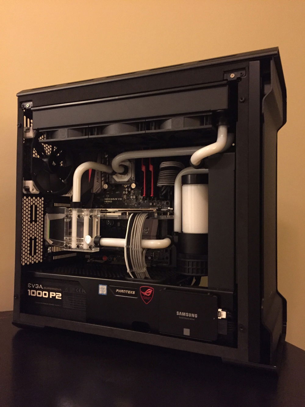 Custom water cooled build with hard tubing. Using Pastel WHITE EK-Ekoolant (no longer available).