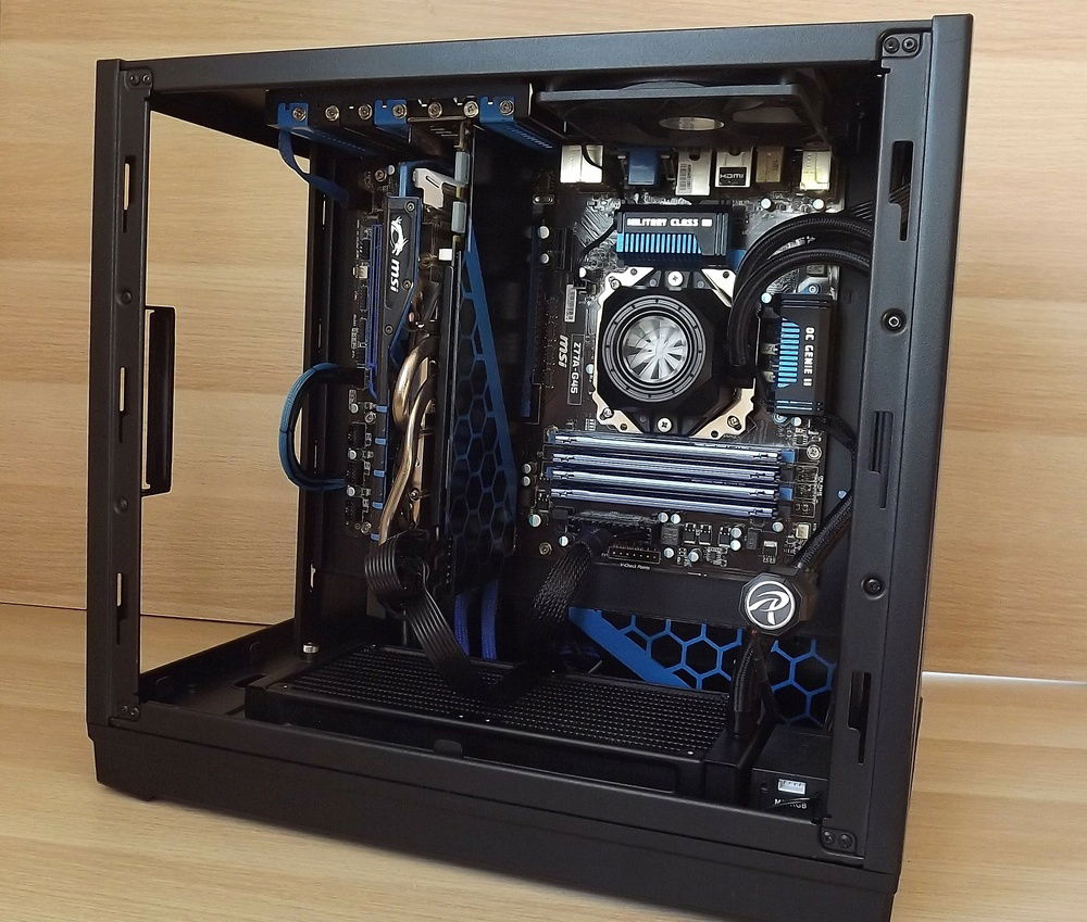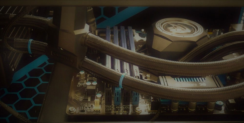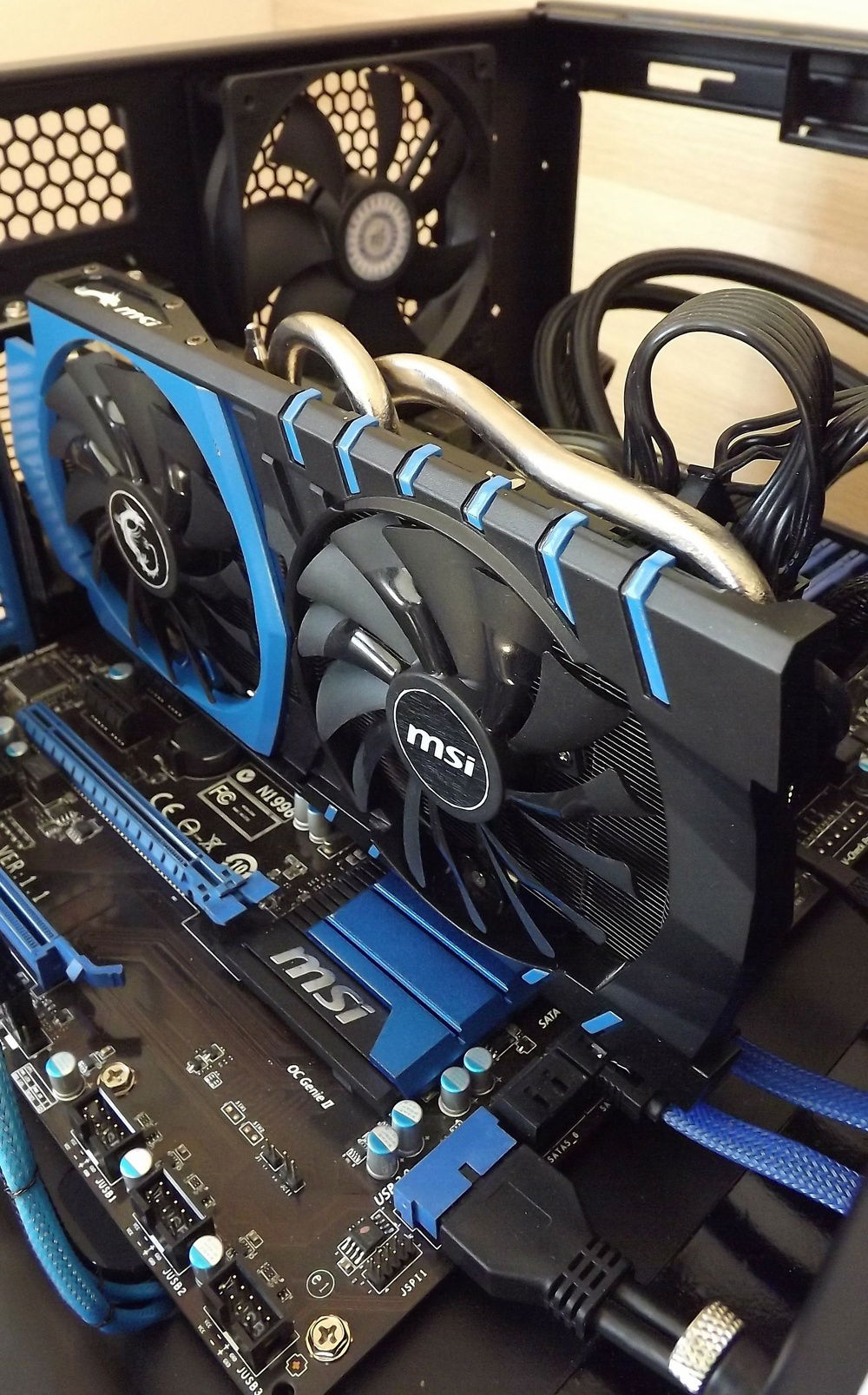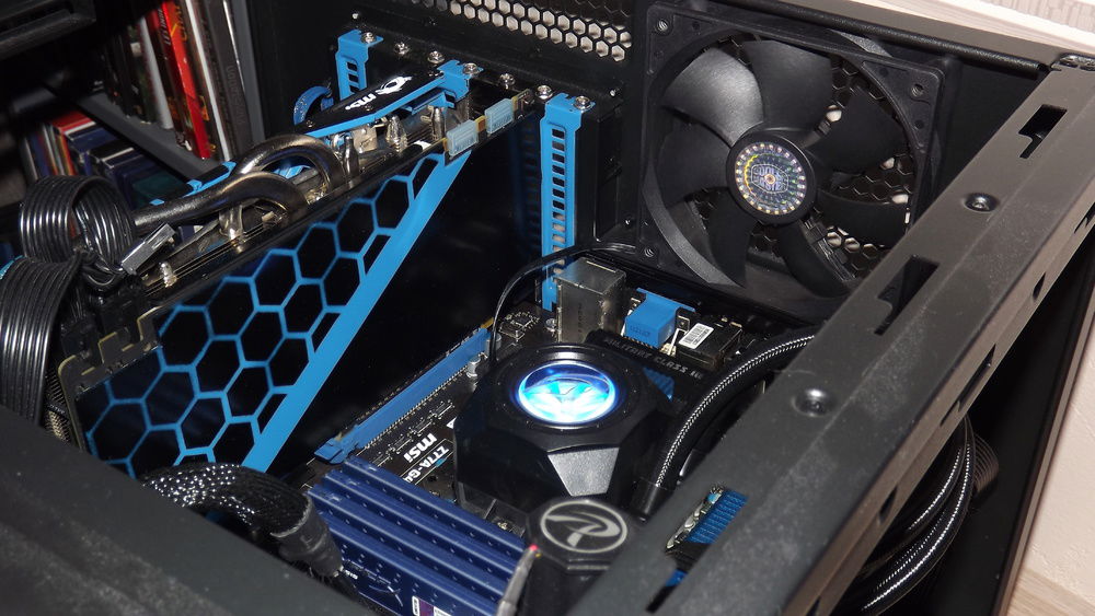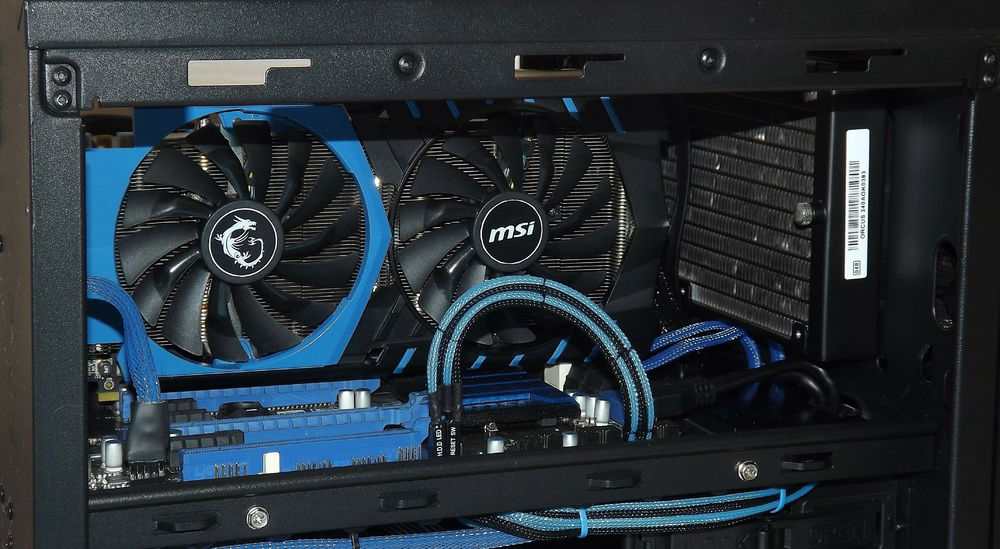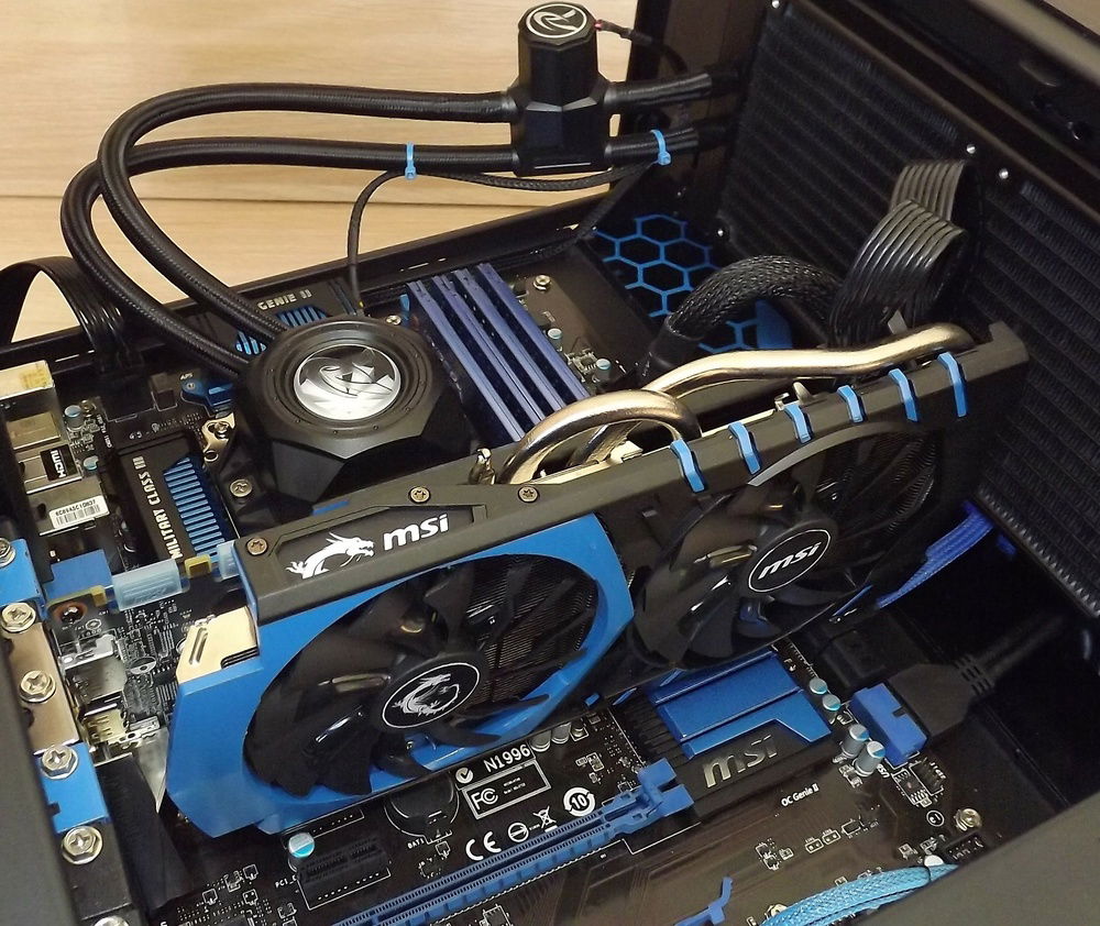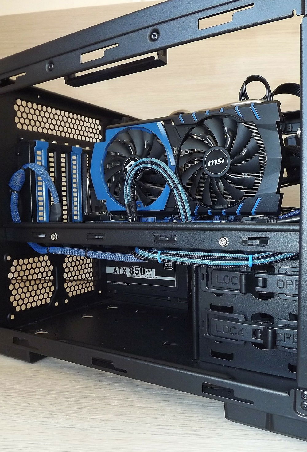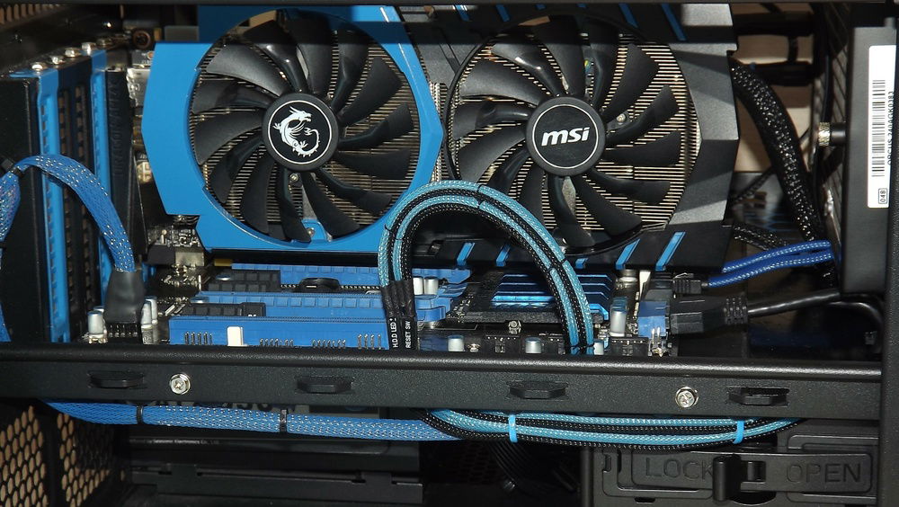 My modifications made: - Painting in blue hull of the GTX970, - Homemade of a back plate, and painting - Homemade of a cable cover, and painting - Sleeving of Case's cable