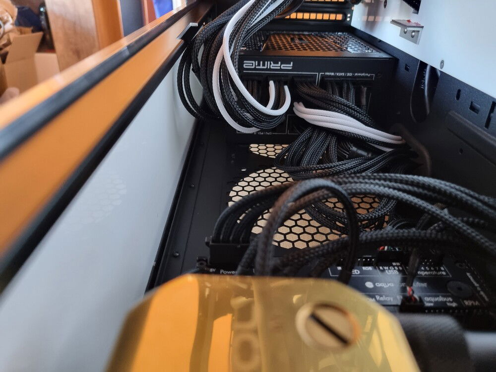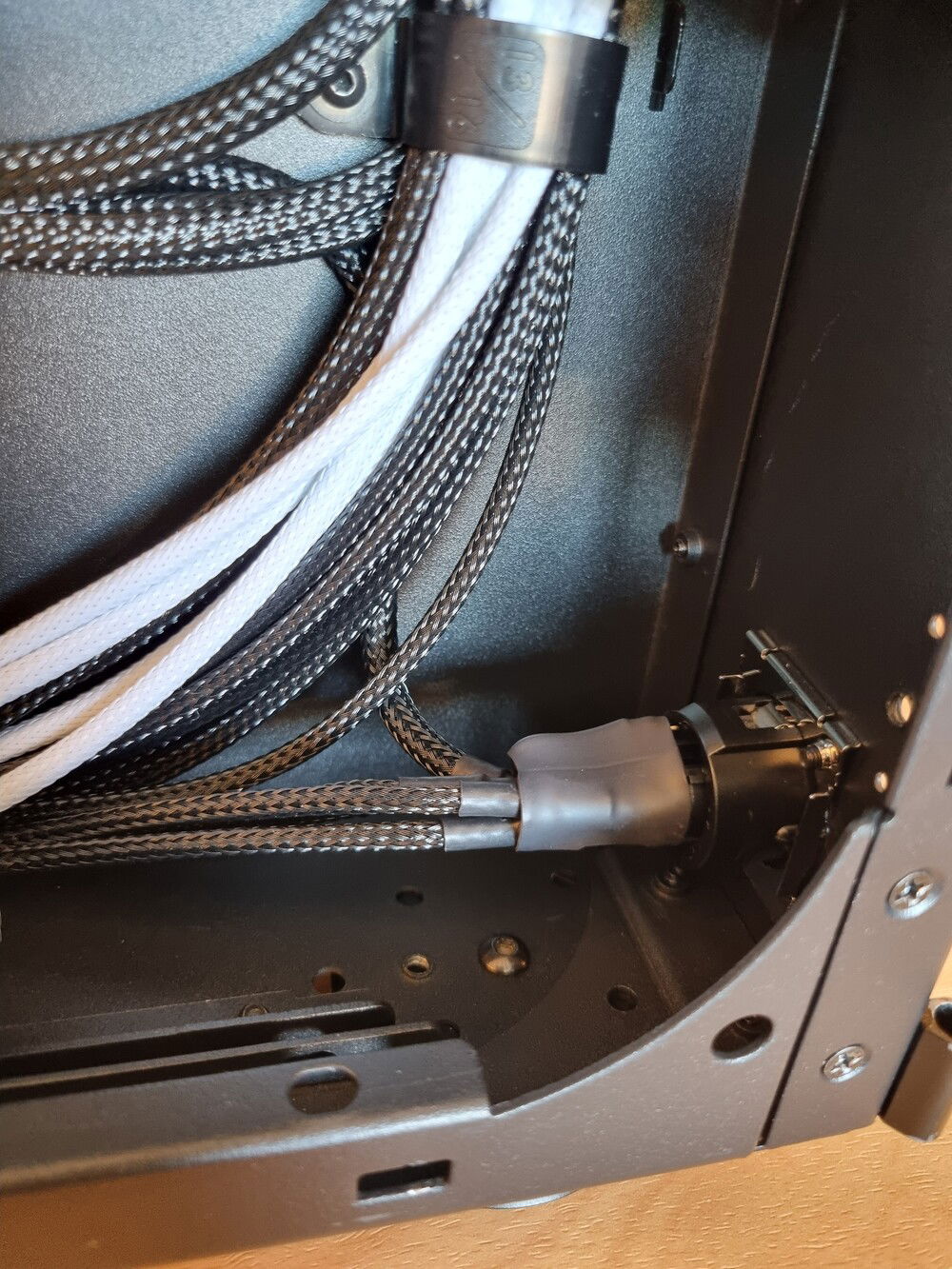 Almost all cables, such as the PSU, USB or FAN Cables, are made by hand by cutting them into the required length, crimping and afterwards sleeving them.