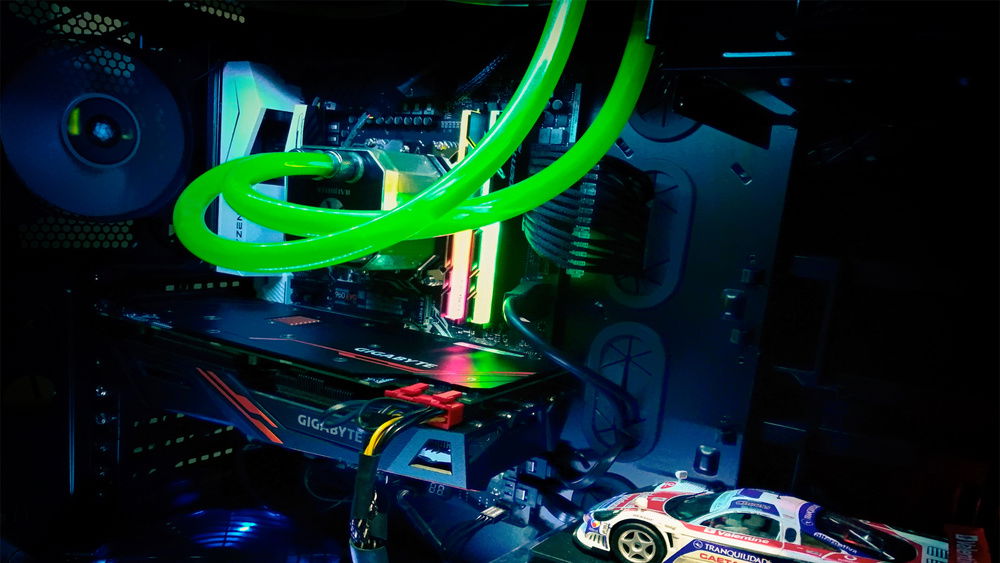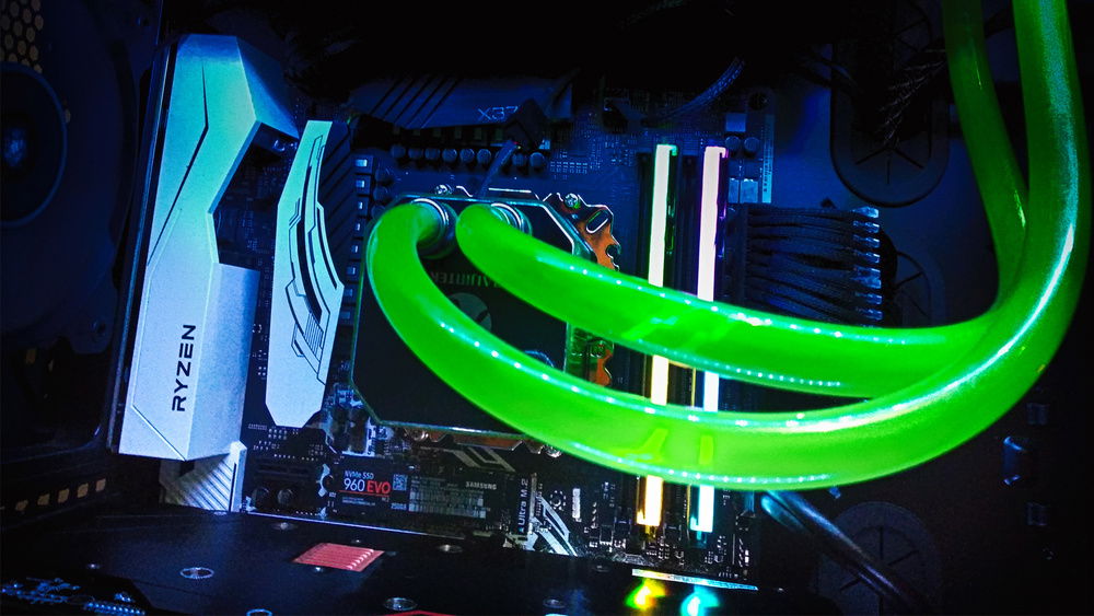With Raijintek Triton AIO cooling and 16GB G-Skill RGB ddr4 3200 mhz Ram.
