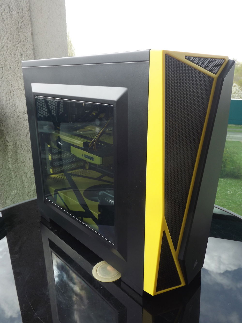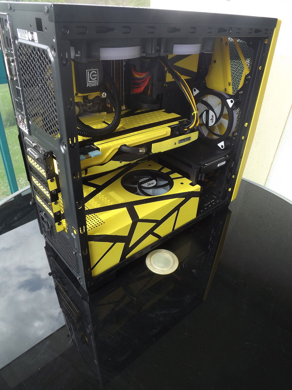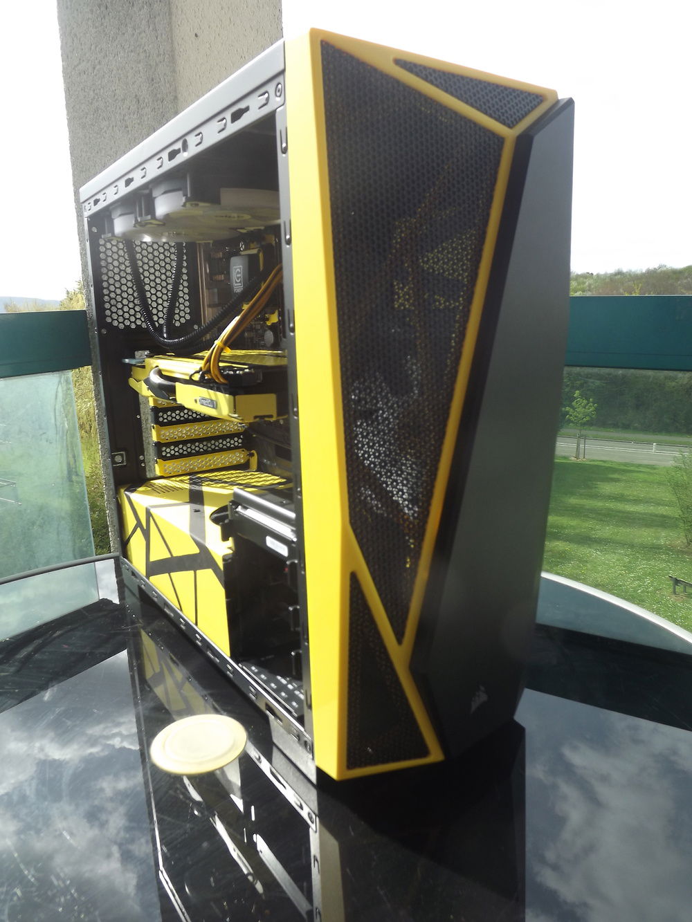 Salut , Présentation du pc que j'ai réalisé pour mon frère. Le jaune est dans le jeu! - Peinture de la coque et backplate de la GTX970, - Création d'un cache alimentation,