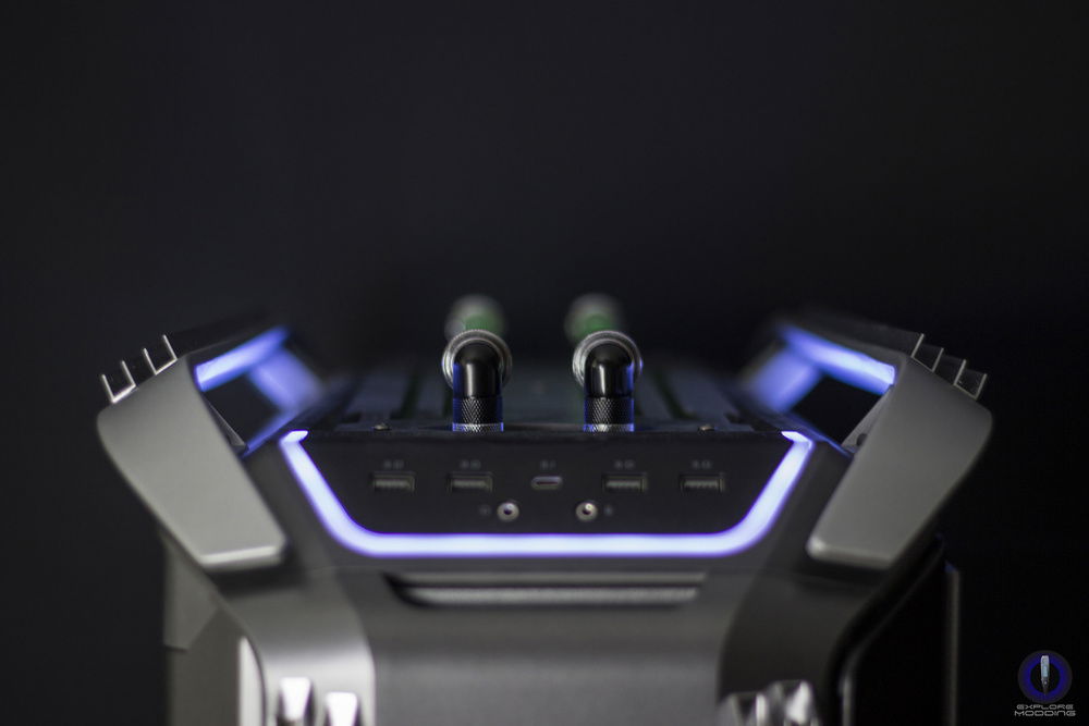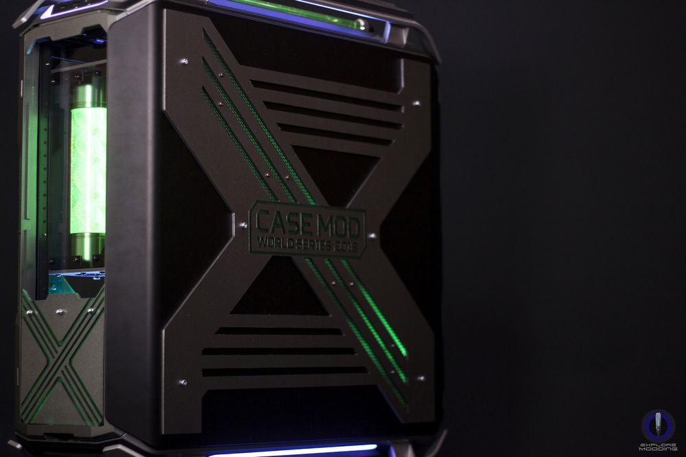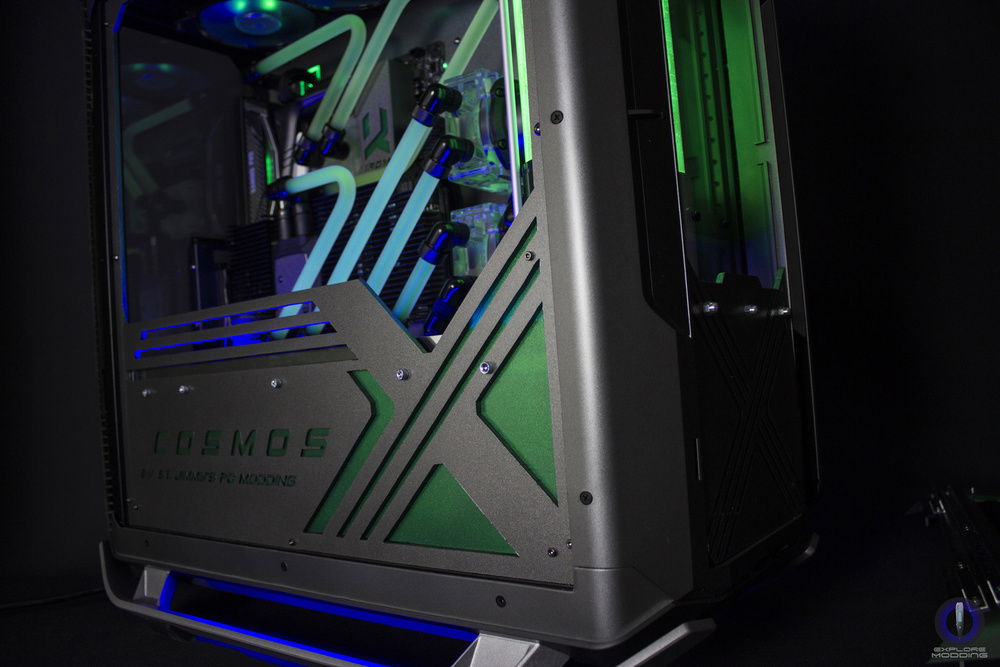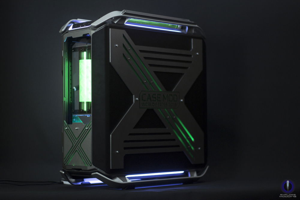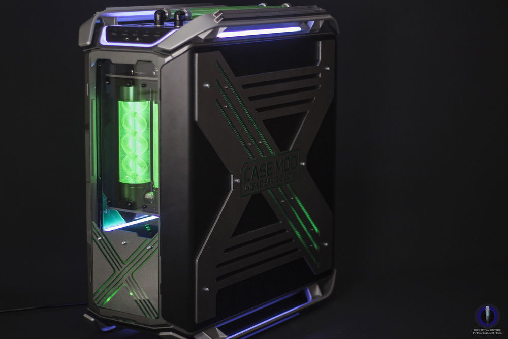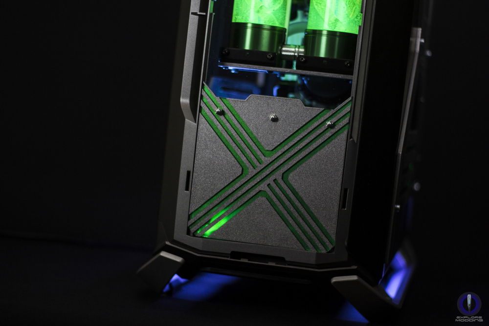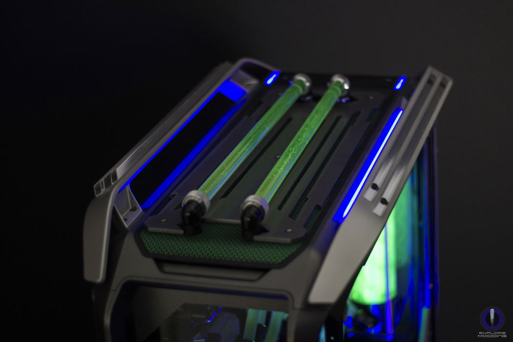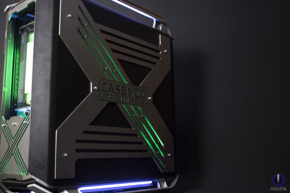 A mod based on X lines and gunmental and green colours. Everything in this build follows certain angles creating this particular X flow. It features 100% handcut acrylic panels and aluminum L-profile for a more aggressive accent. All the LEDs are RGB, so they can be switched between blu-green-white, depending on which type of look is desired, UV reactive and aggressive, full green or elegant white.