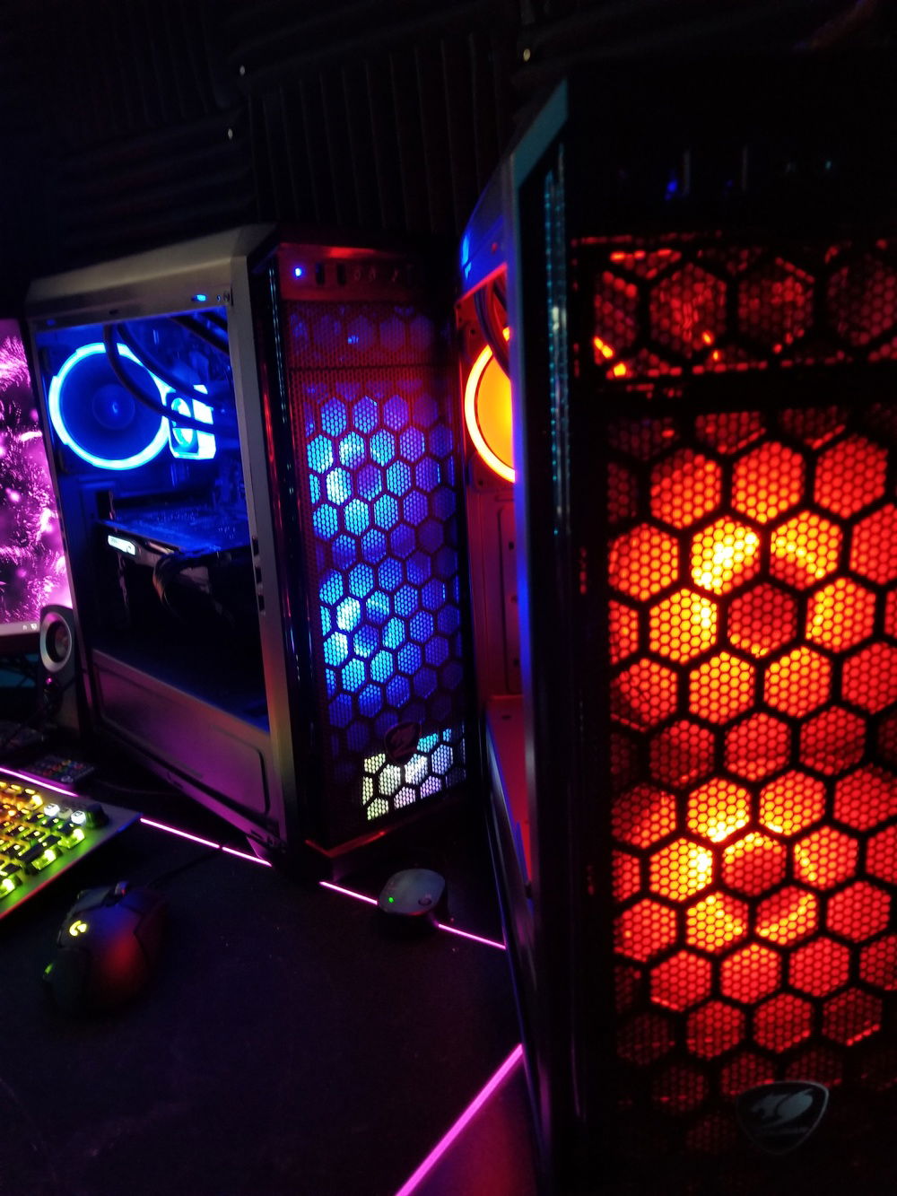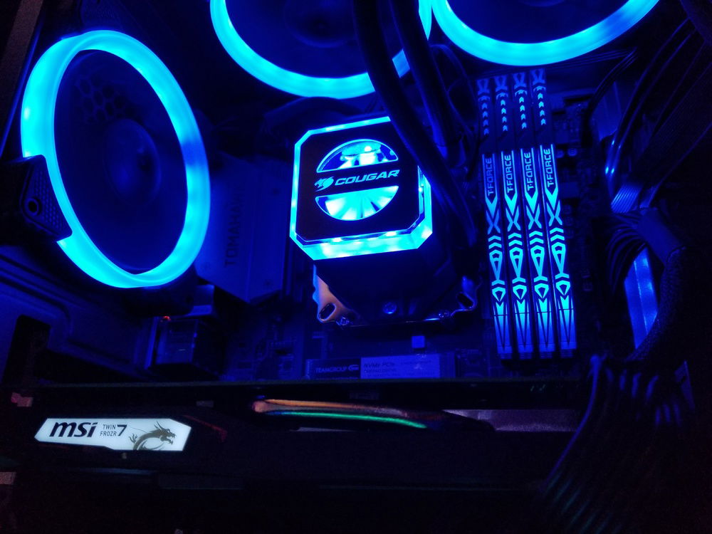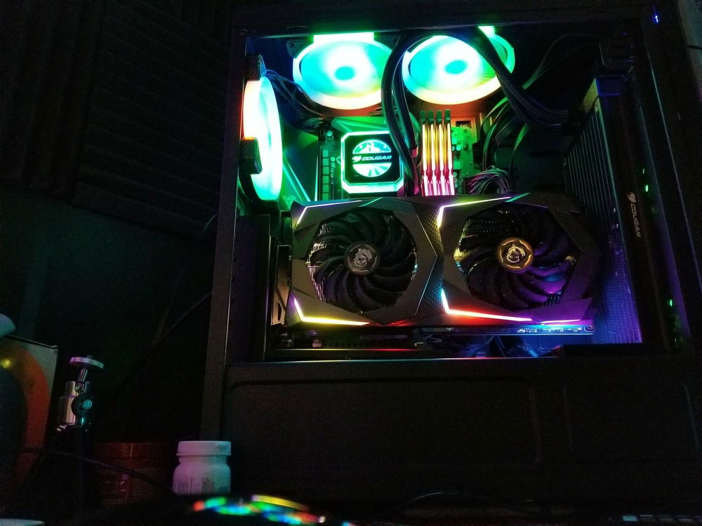 Cpu- Amd Ryzen 2700x Motherboard- Msi B450 Tomahawk Ram- 32g Team Group Excalibur Totem Gpu- Msi 1650ti Cooling- Cougar helor 240 aio + 5 Cougar Vortex fans Case- Cougar mx330 Key board- Cosair k series mouse- Logitec g602