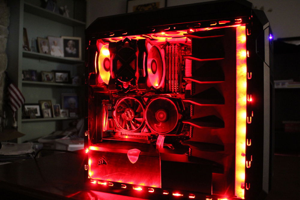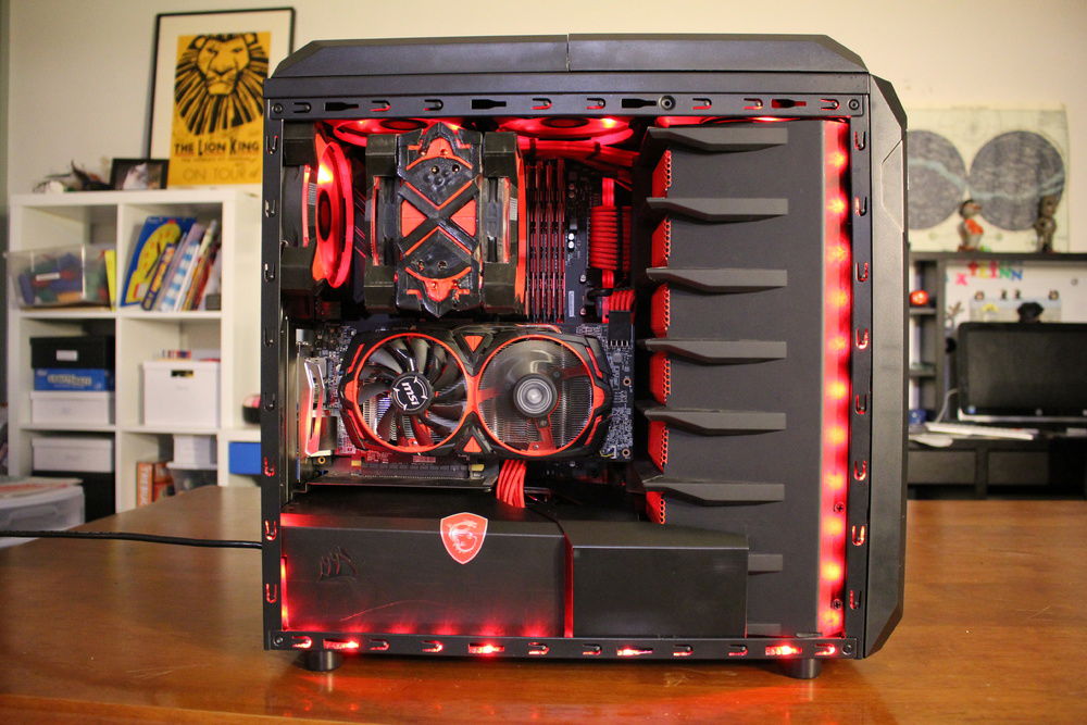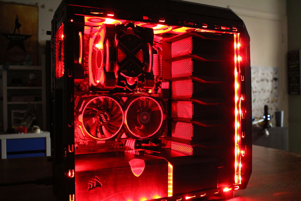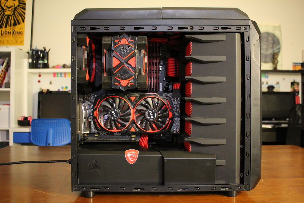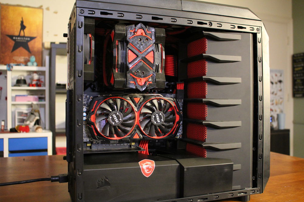 This is my first Pc build and mod. I add a PSU cover, designed and 3D printed fan shrouds to compliment the GPU. I modded the top of the case so the 3 fans would be centered and raised up about 5/8". I add one extra fan to the top. Than I, made a custom top grill by using two front covers. I painted all the dust filters red. I used the top panel of the Corsair 740 Air as a drive cage cover. That's my favorite part. The finished product is pretty nice.