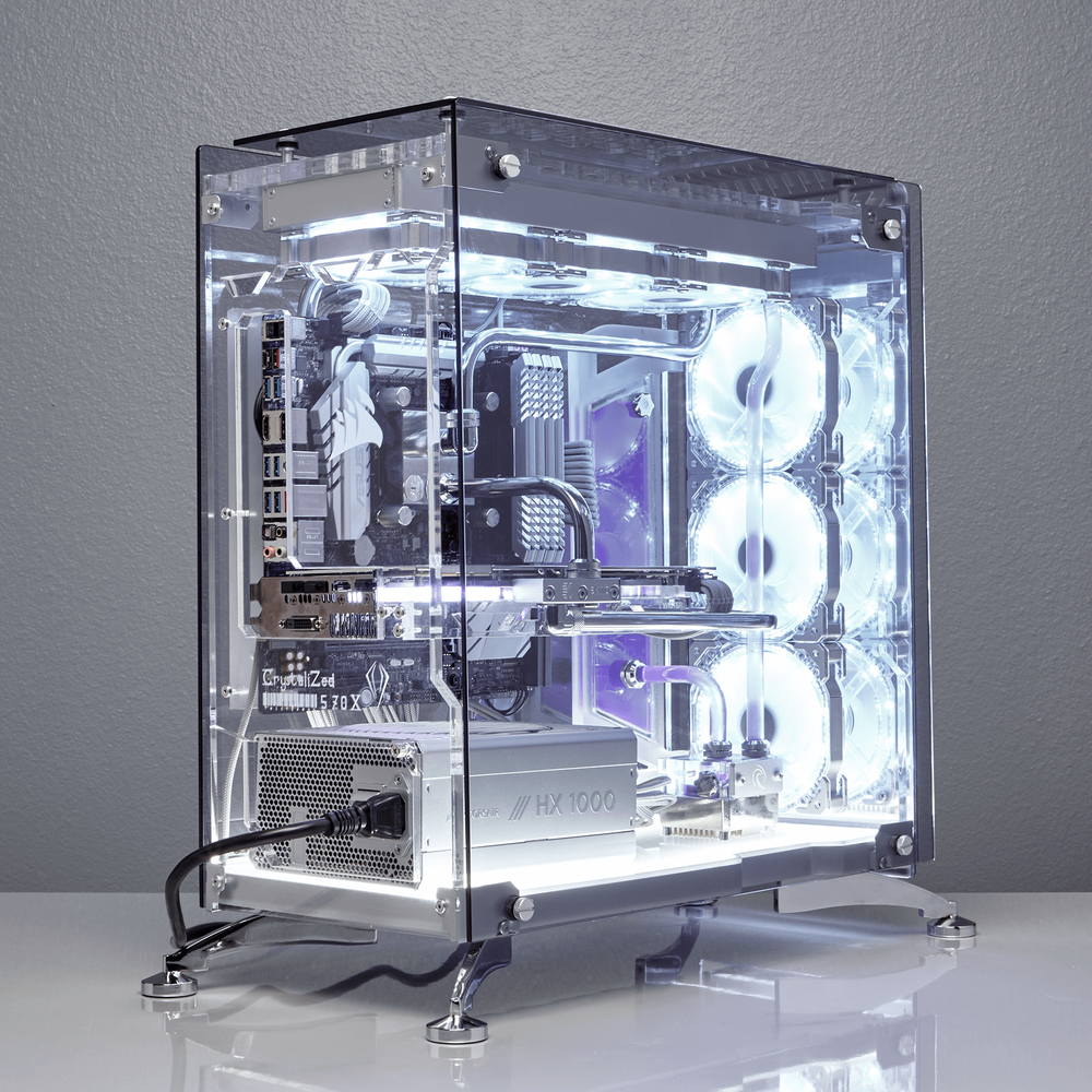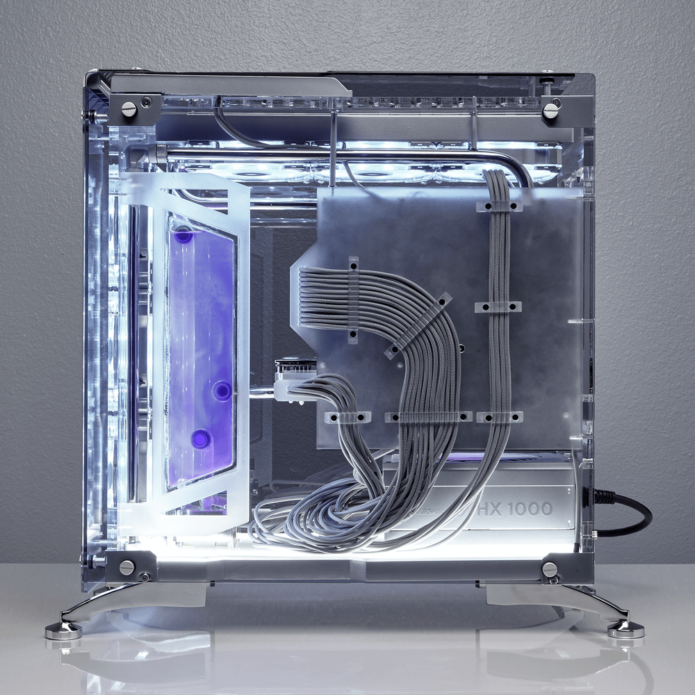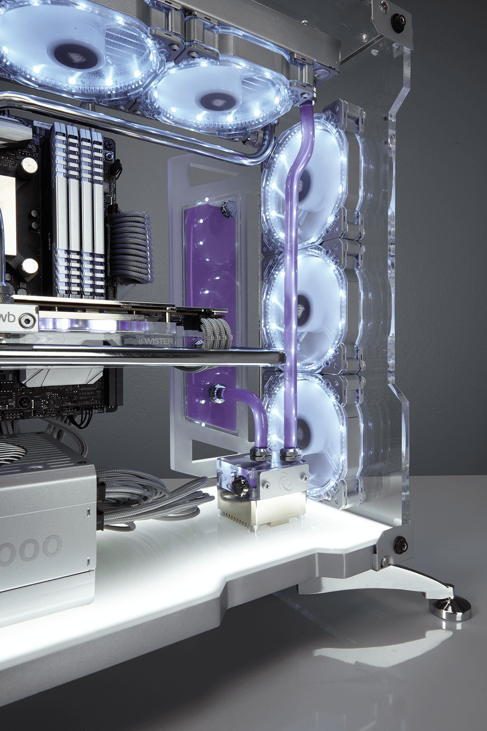 Daniel Bolognesi’s CrystaliZed asks up the question, what if an entire chassis was clear? With custom clear acrylic panels, the chassis appears to be crystallized, seemingly a floating platform for the custom reservoir, nickel-plated hardline tubing, and hand-painted silver internal components. With the addition of chromed feet and beautifully routed sleeved cables, it exudes opulence.