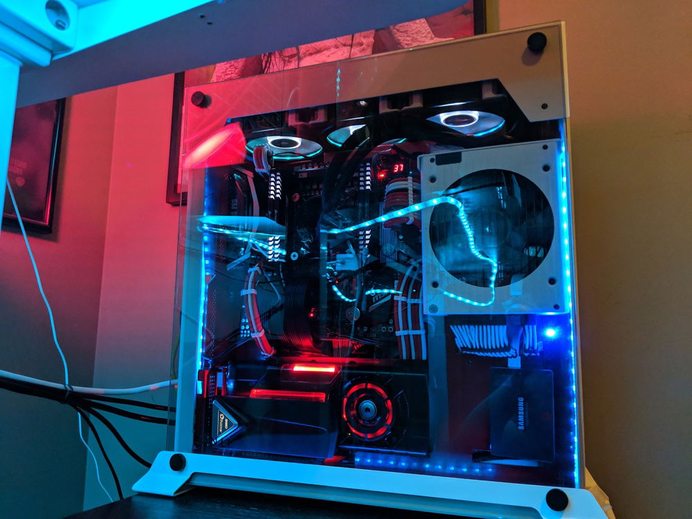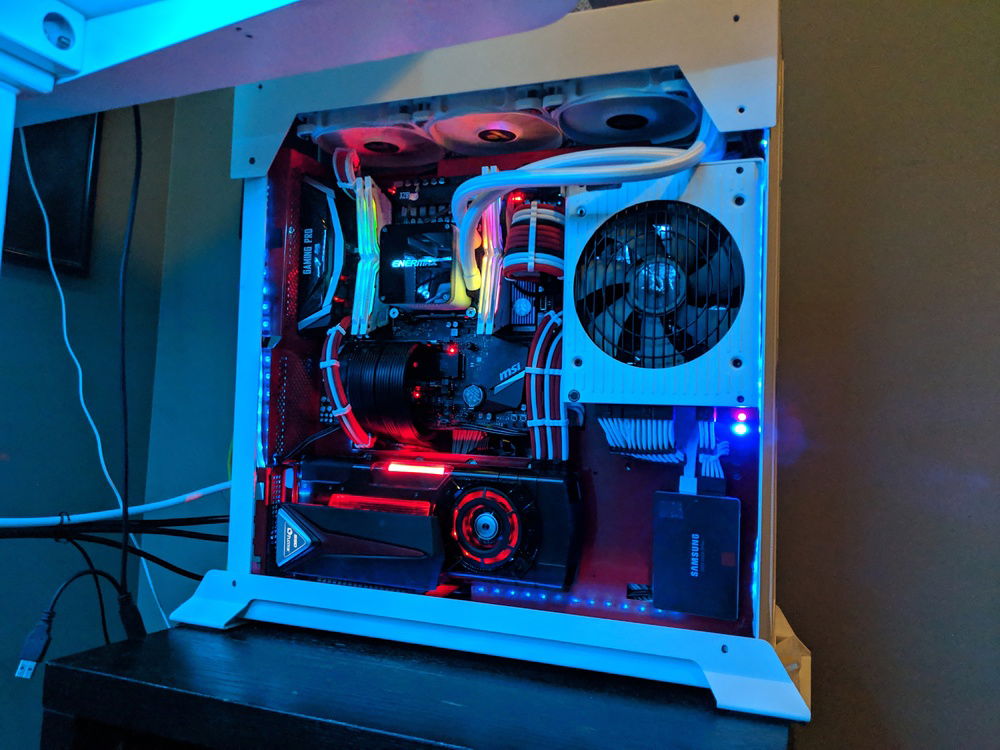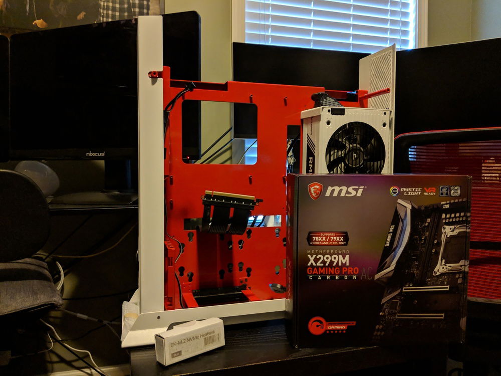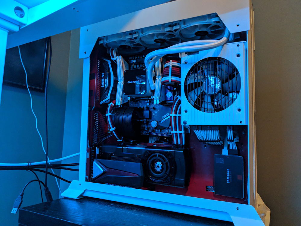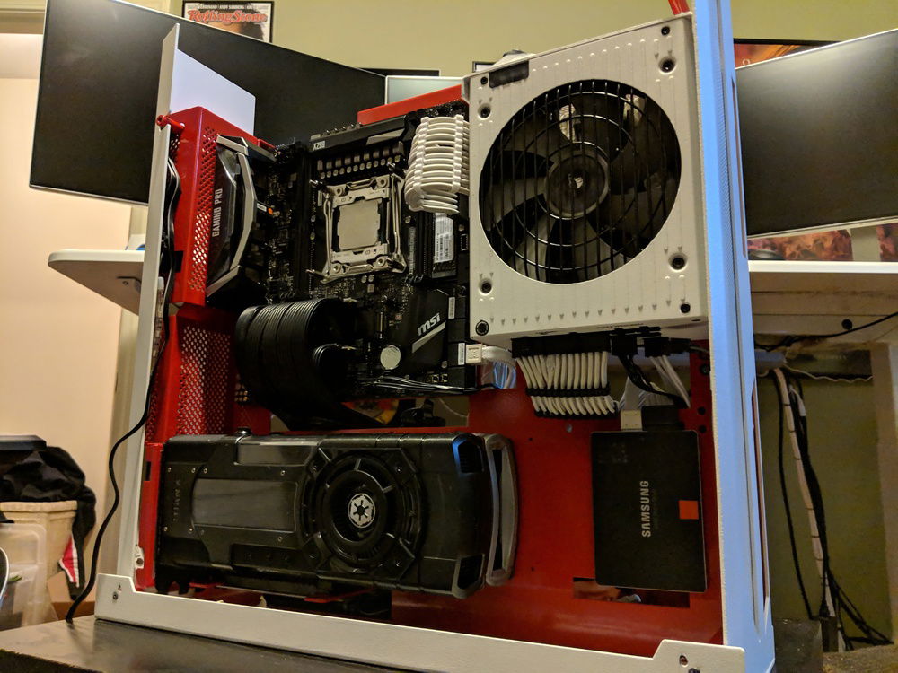 Had to move around parts and built in a custom power coated Lian Li 06SC in red and white. for those who know this case, it is a pain to build in, but happy with the end result. Overclocked to 4.5 Ghz all cores stable. Tuned for Autodesk Maya and some gaming on the side.