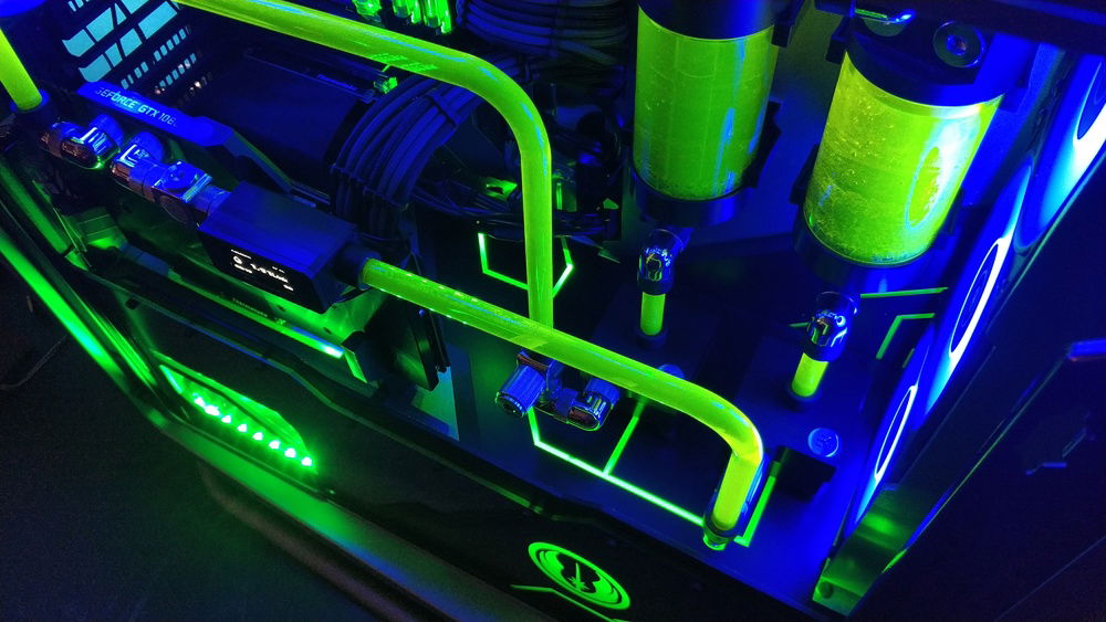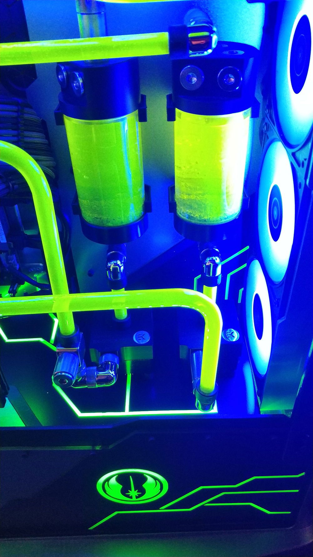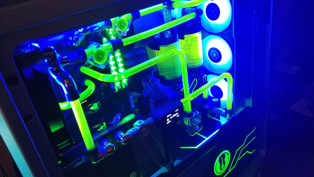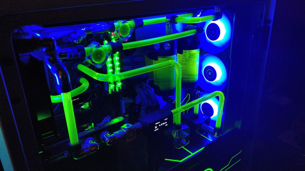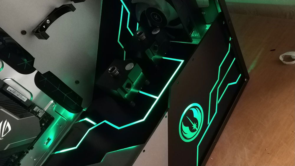 The Gpu was vertically mounted, for fit our design idea, the custom parts are made by acrylic with custom logo's!