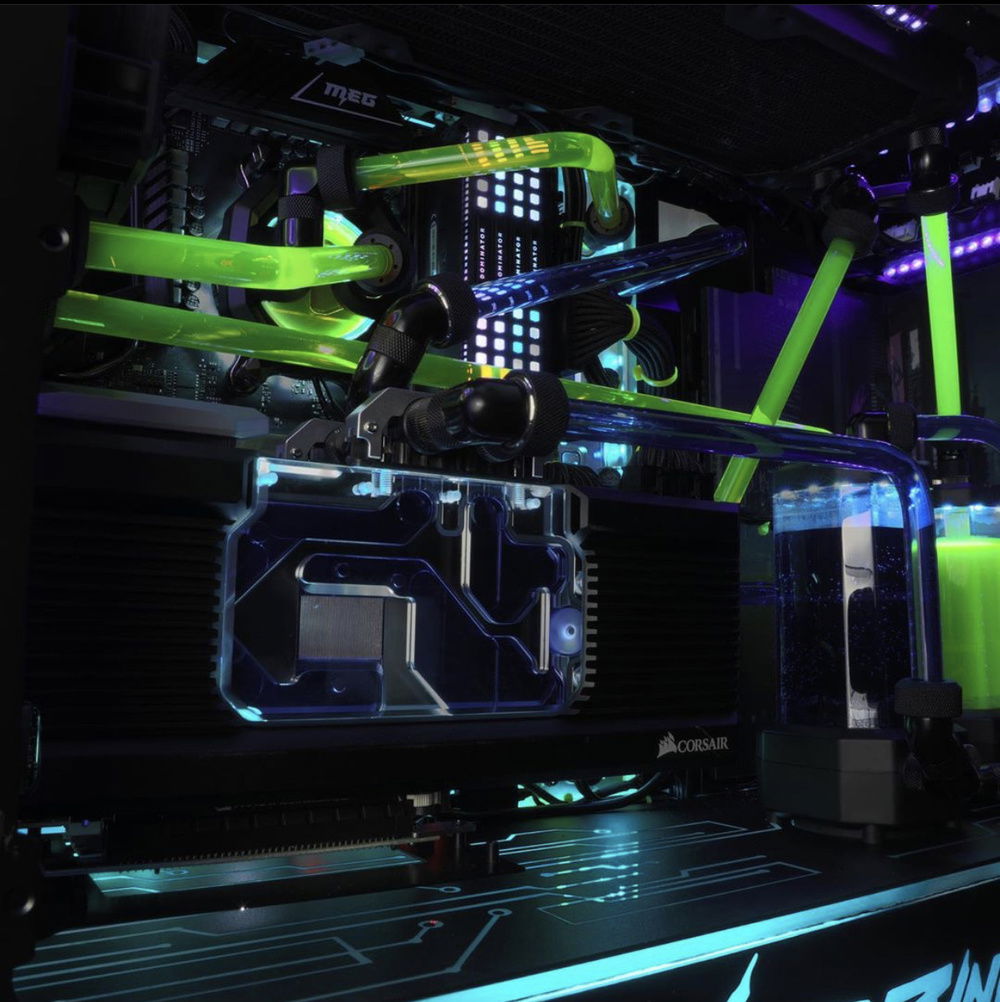 I was tasked to come up with a bad ass setup for next years upcoming anticipated game cyberpunk 2077. I honestly still get blown away when I sit back and look at it. System is spec’d in our flagship PRIME GENESIS case, MSI X570 godlike Mobo, AMD RYZEN 3900x, 32gb of Corsair Dominator RGB memory, 2tb Corsair m600 for the OS, 2tb Seagate firecuda for the storage, 2x Nvidia RTX 2080ti’s, and amazing insane amount of RGB and UV! @chris.designs came through with the quickness with that killer RGB PSU cover plate we had imagined in our heads. It’s like he opened up my skull and plucked out exactly what I was thinking! Corsair hooked it up with all the Hudro X components to help me with that look i wanted and was imagining. Looking at the pics just doesn’t do justice. If you want complete specs and performance of this monster check out the video that Linus Tech Tips dod with is on his youtube channel
